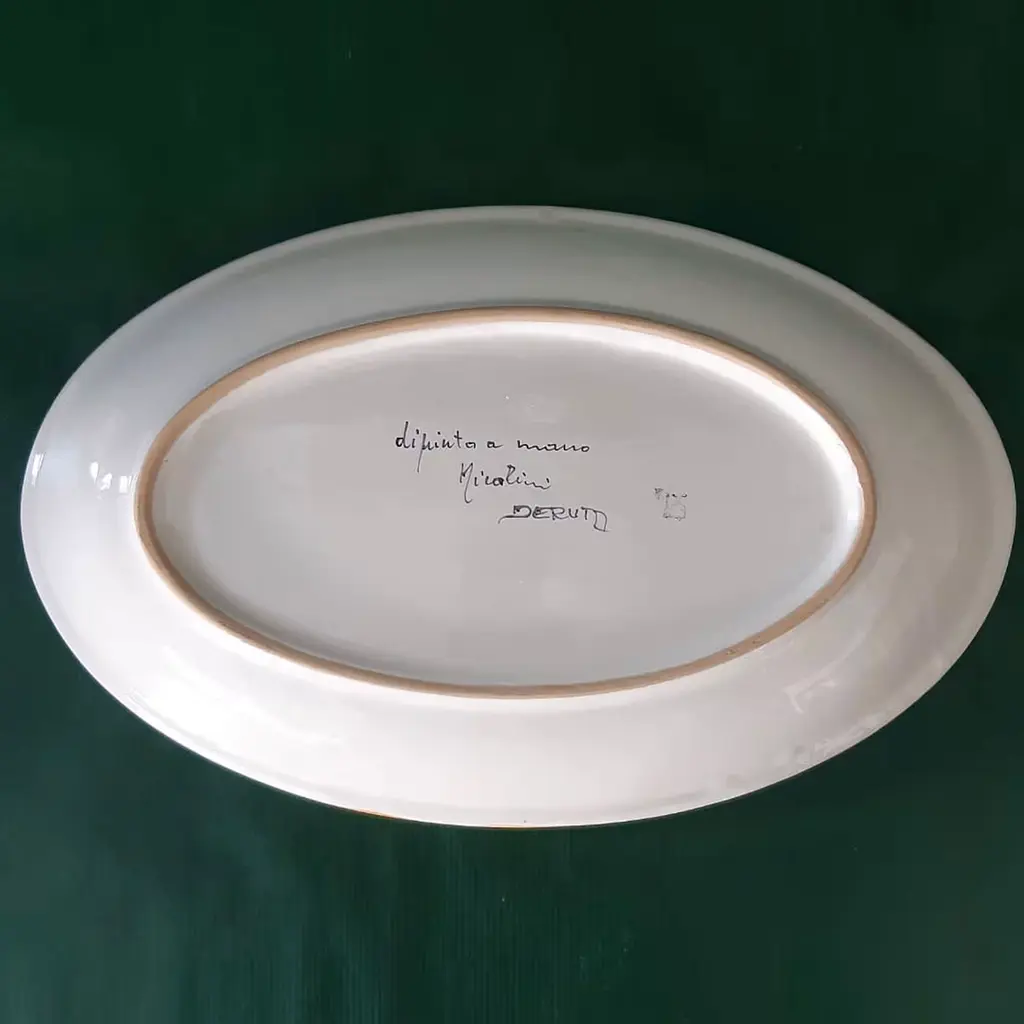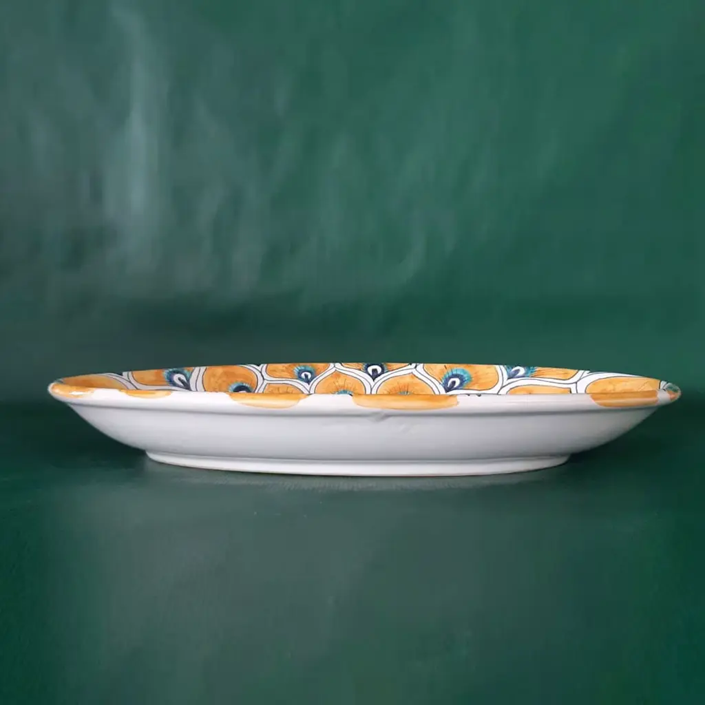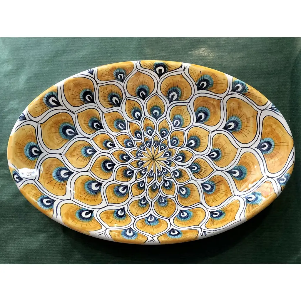 Ideal for serving a fish or canapés on a breath-taking backdrop, this one-of-a-kind oval majolica plate was designed and minutely hand-painted by master ceramist Maria Rita Nicolini. It flaunts a radial motif of vibrant peacock feathers rendered in vivid shades of blue and yellow. Part of the Yellow Peacock Feather Collection, the piece may showcase slight variations from the pictured item that attest to its artisan production process.