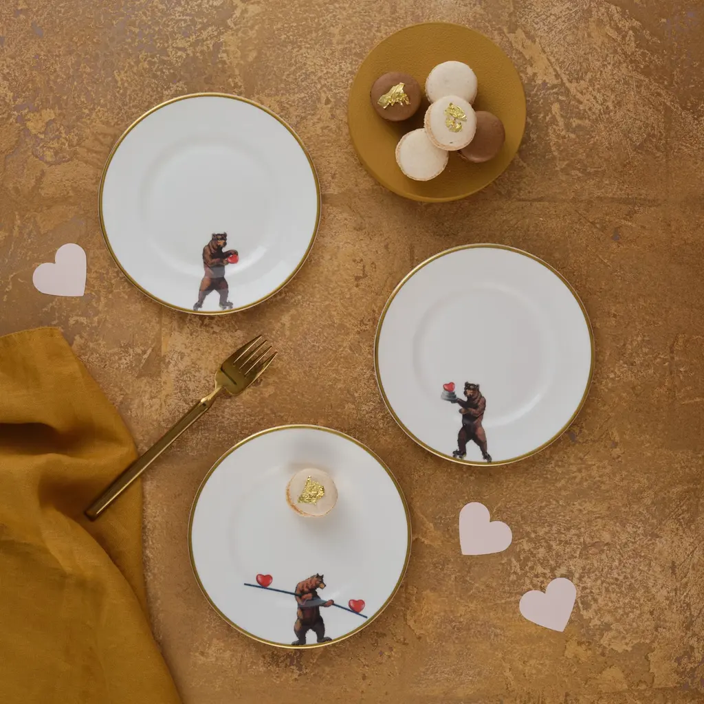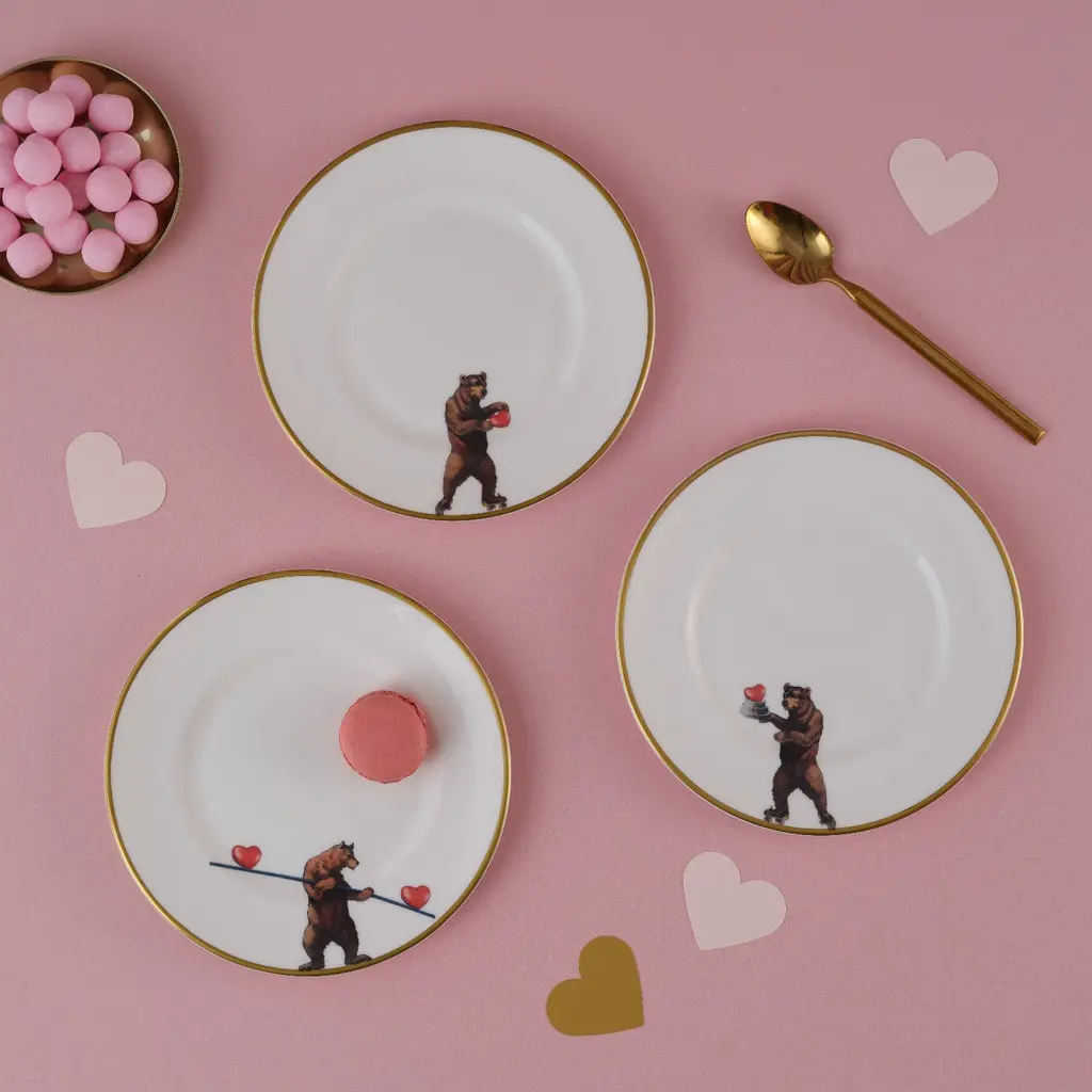 'You Hold My Heart' from the Melody Rose Bearing Love collection, a series of three Bear dessert/side plate designs bringing a touch of fun to the table with a playful take on the theme of love.Charming and witty, 'You Hold My Heart' along with 'Balancing Love' and 'Heart On A Plate' are available individually or a set of three and can be mixed and matched with the whole of the Melody Rose fine bone china collection.Handmade in Stoke-on-Trent, England's pottery heartland, each plate is edged with hand painted 22kt burnished gold for a luxurious and dishwasher friendly finish.The playful design paired with the best of British craftsmanship makes this plate the perfect gift for foodies, design lovers and everyone in between.