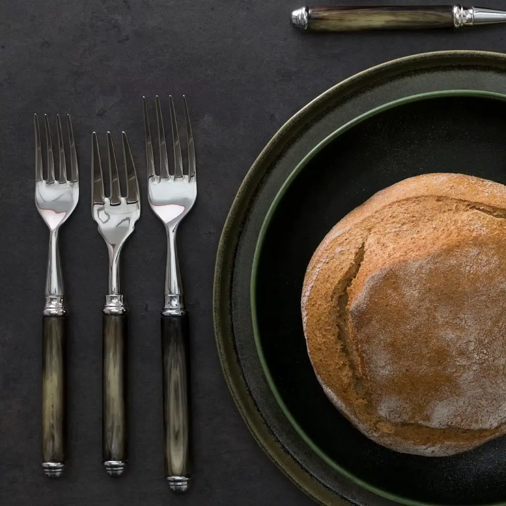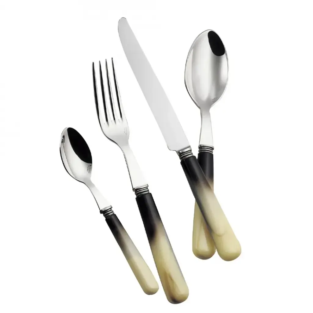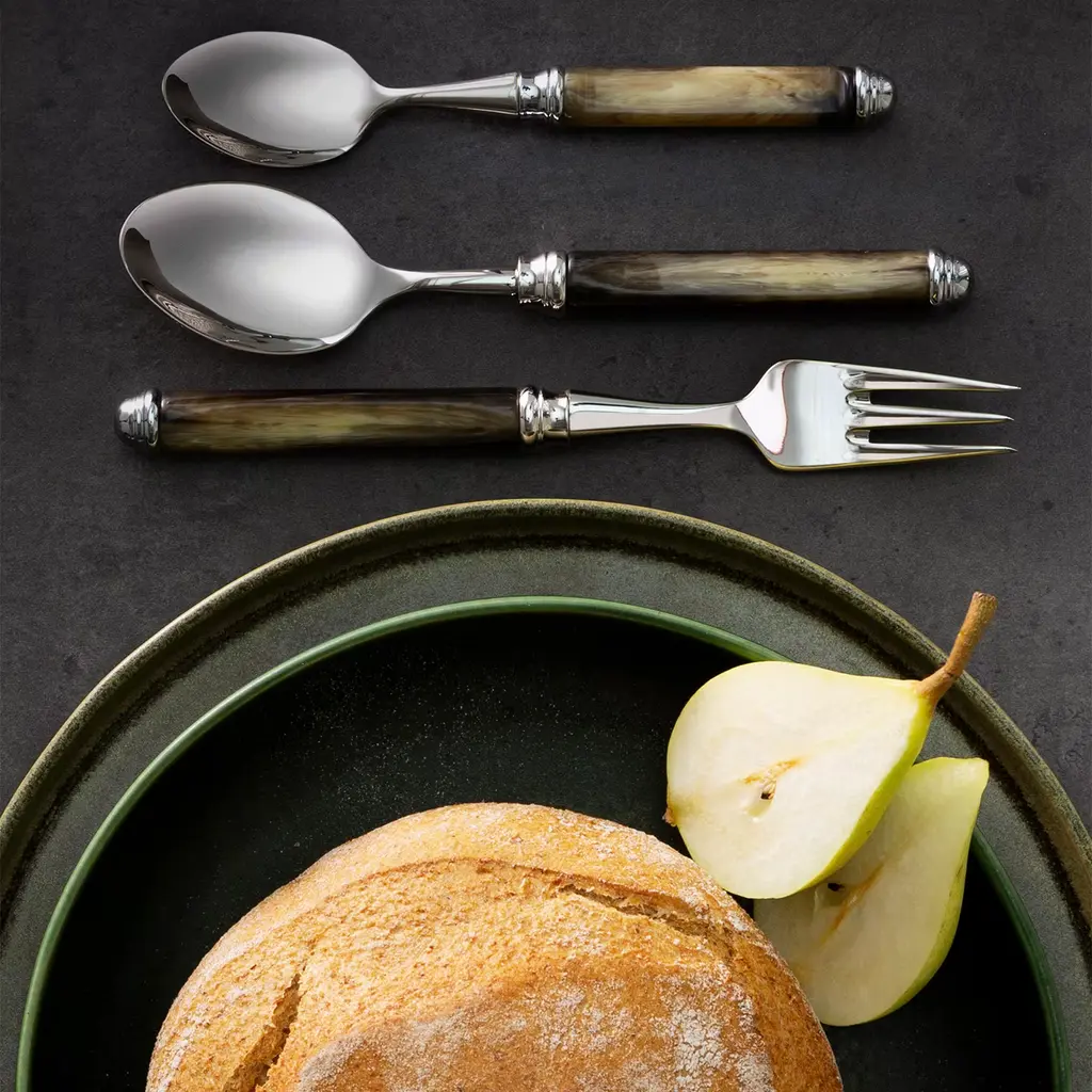 This artful set comprised of one fork, one knife, one spoon, and one coffee spoon will elevate any table setting with its plush personality. The stainless steel frames boast a glistening mirrored finish that stands in captivating contrast with the animal horn-like appearance of the handles, exquisitely handcrafted of plant-based, sustainable certified resin. The set is delivered with a luxe velvet case. Please contact the Concierge to purchase items separately.