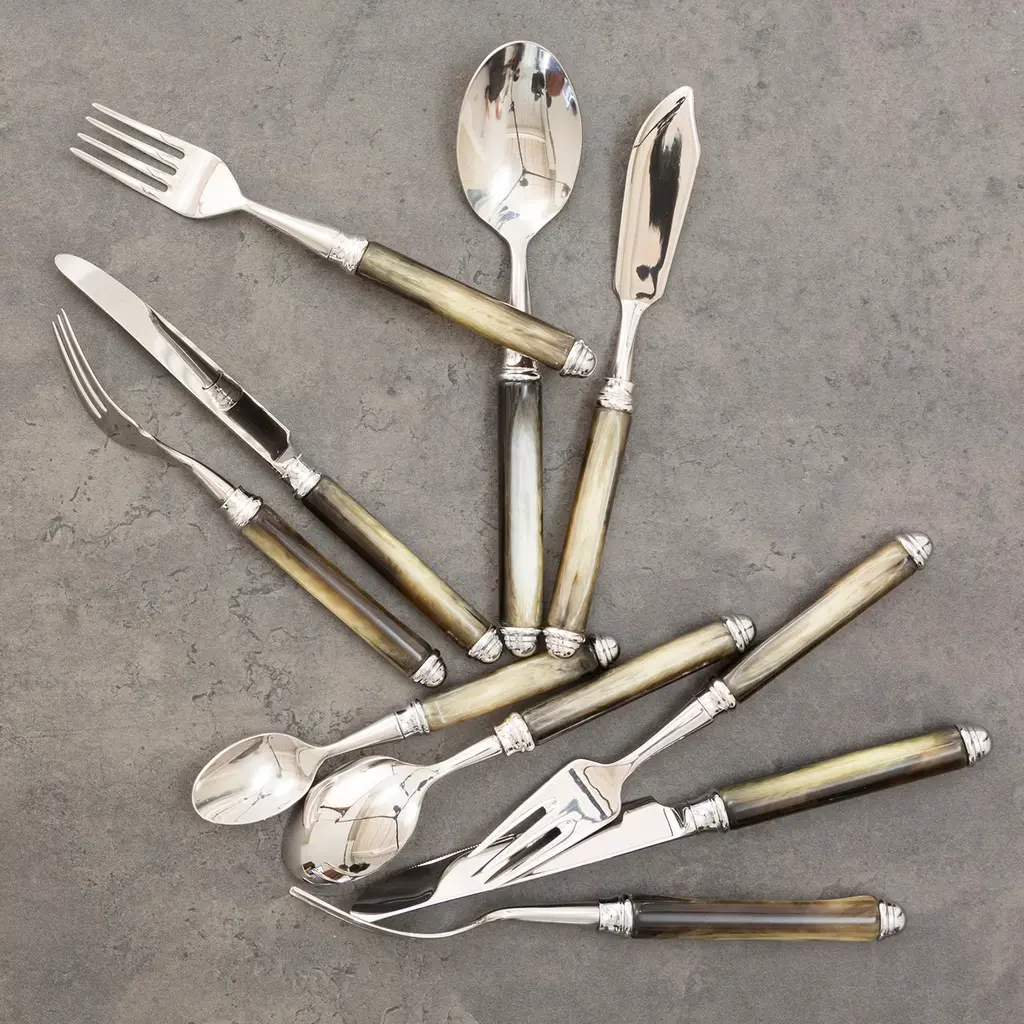 Sophisticated yet not compromising on exclusivity, this cutlery set of a knife, fork, spoon, coffee spoon, and fruit fork and knife evokes the fascinating flair of wildlife. Meba Bioresine, a certified sustainable bio-based resin, characterizes the handles, while the upper parts are crafted from glistening stainless steel for exceptional resistance and aesthetic appeal. Comes with a velvet holder.