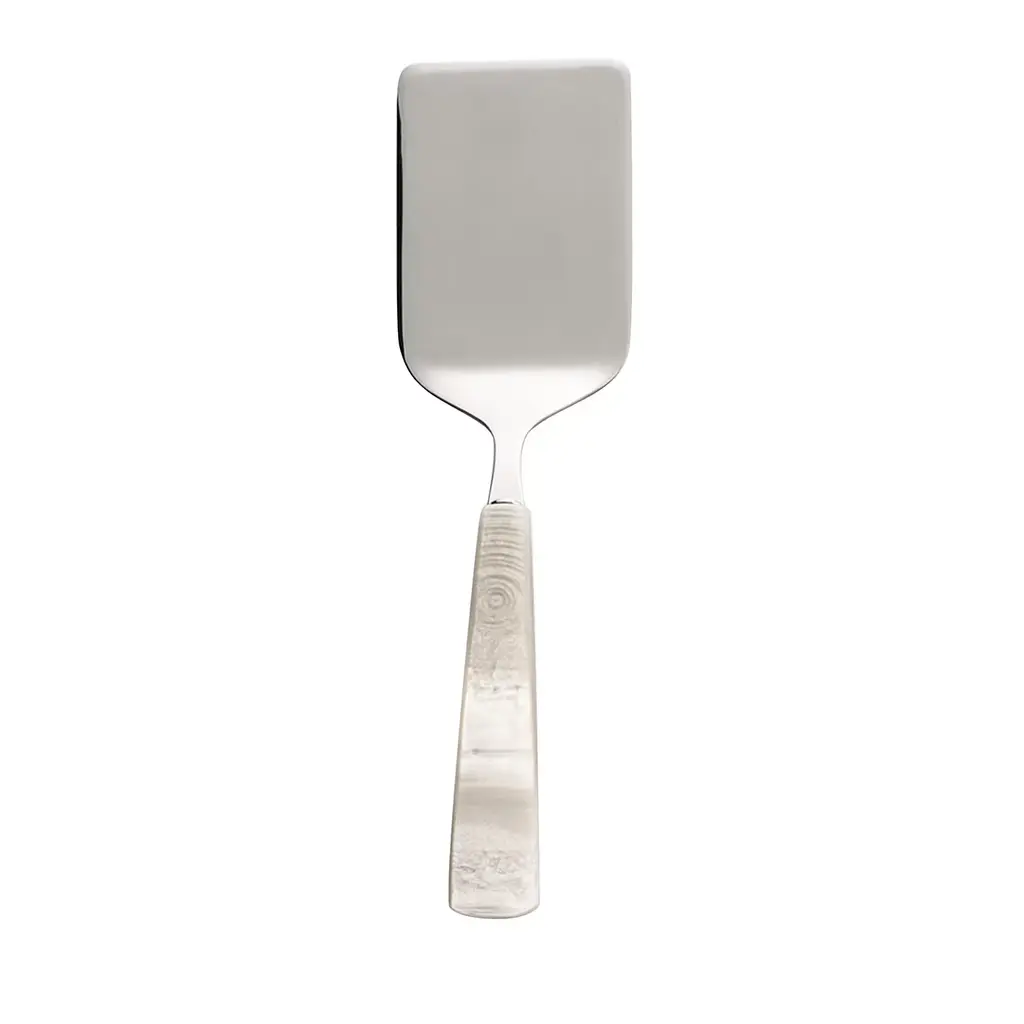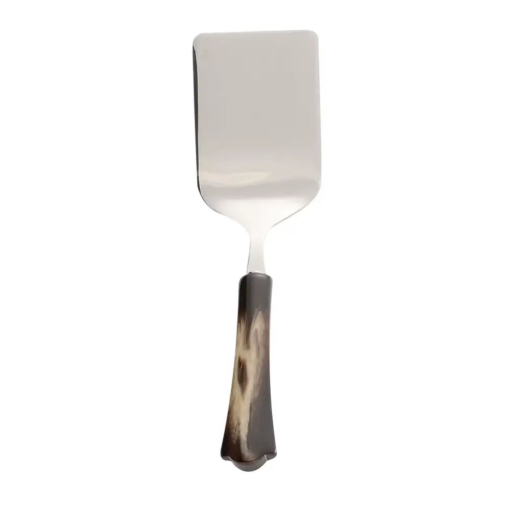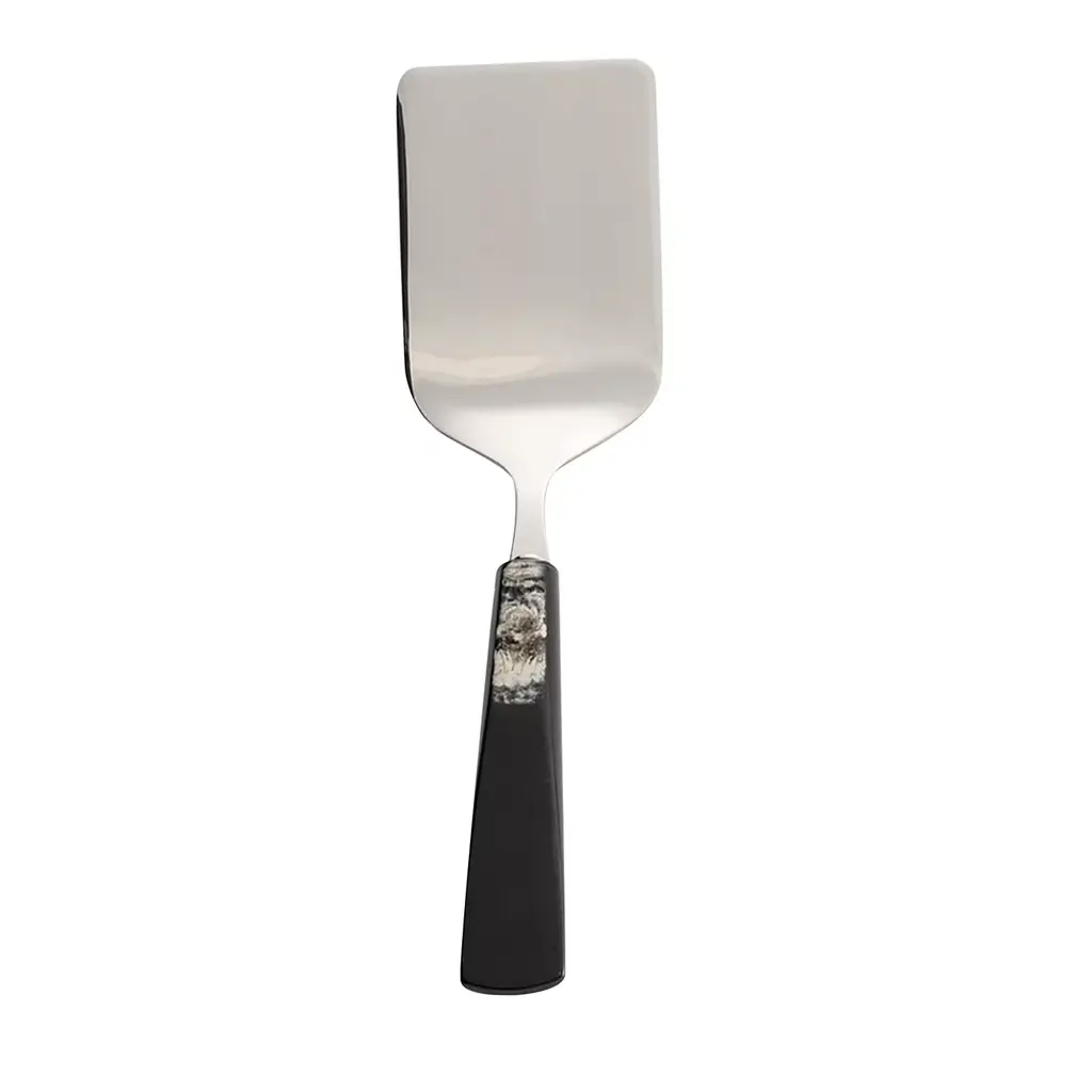 References to precious African horn meet the timeless elegance of classic cutlery. This superb set of two flat serving spoons makes for a refined addition to a personal collection for aficionados, its pieces featuring handles in bio-based certified resin that reproduces the shades of horn and counterbalances the sleek look of the upper parts in glistening stainless steel. A fine velvet case is included with purchase.