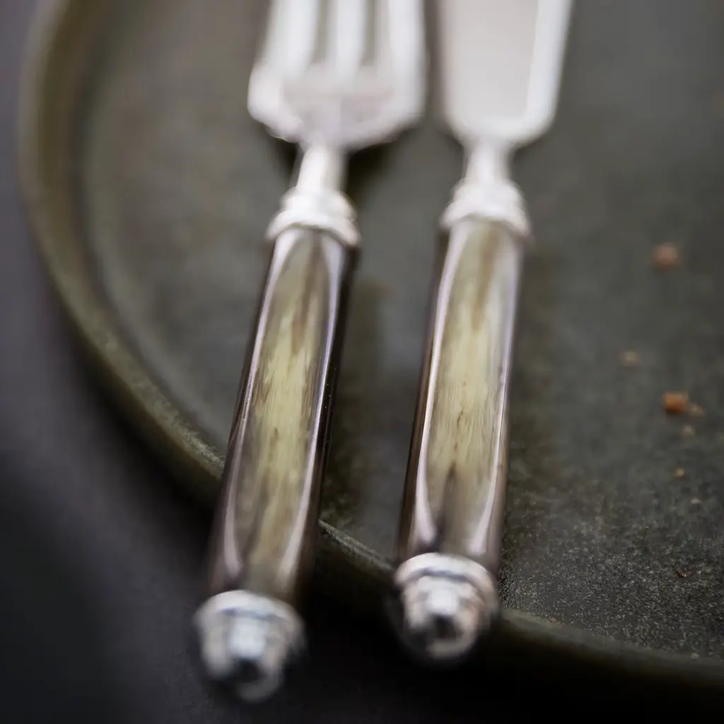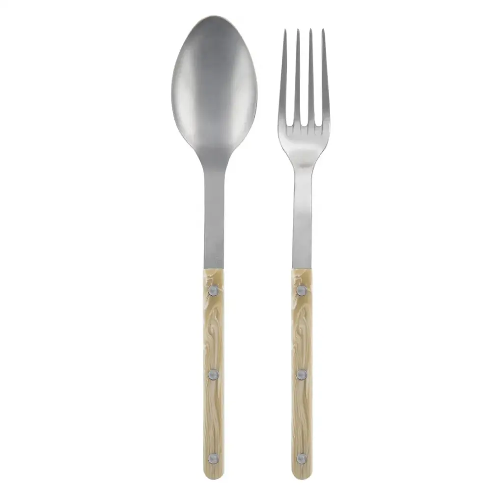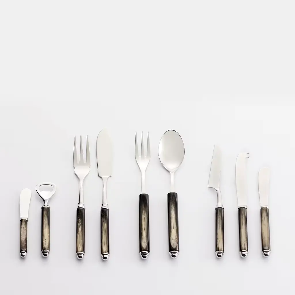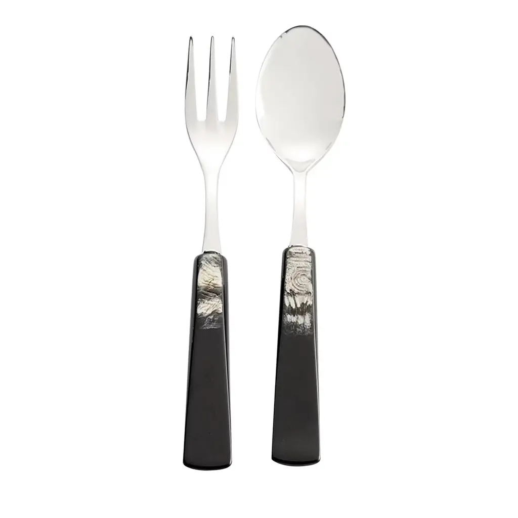 Minimalist profiles ennobled by exceptional materials and designs define the charming personality of this two-piece serving cutlery. Easy to use and portion food with, the pieces are handmade from glistening stainless steel, complemented by fascinating handles in bio-based Meba certified resin reproducing the shades and veins of natural horn. It pairs beautifully with other elements from the Zambia series. Fine velvet case included with purchase.