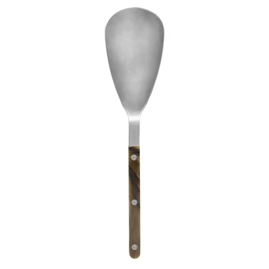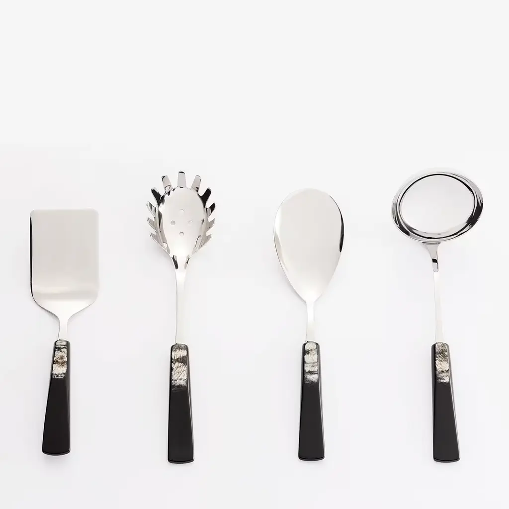 Delivered in a refined velvet case, this exquisite set of two spaghetti serving spoons will add unexpected elegance to the convivial and simple gesture of filling plates with traditional Italian pasta recipes. The precious handle handcrafted from sustainable bio-based resin is exquisitely adorned with veins accented with earthy hues, harmonizing with the glaring look of the silhouettes in mirrored stainless steel.