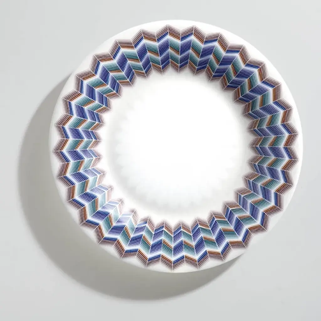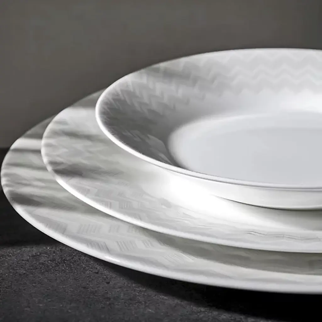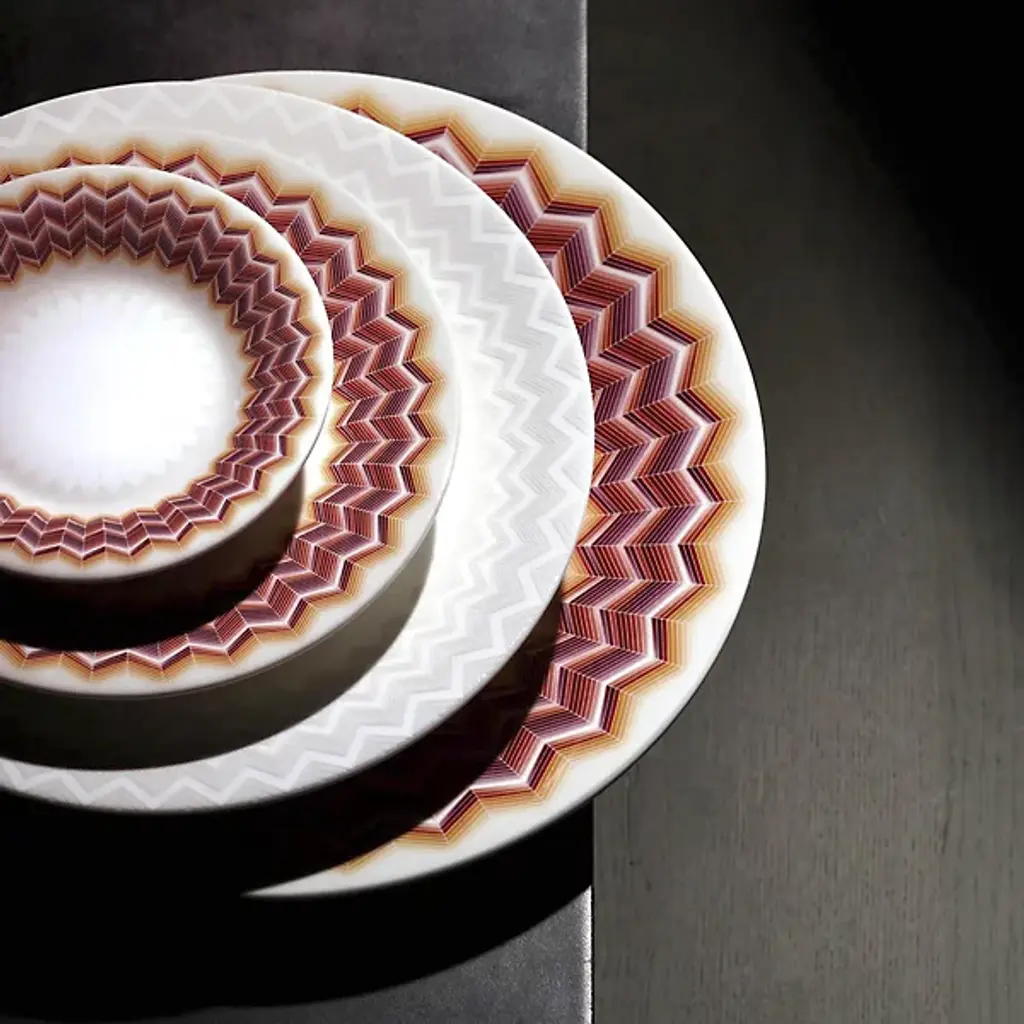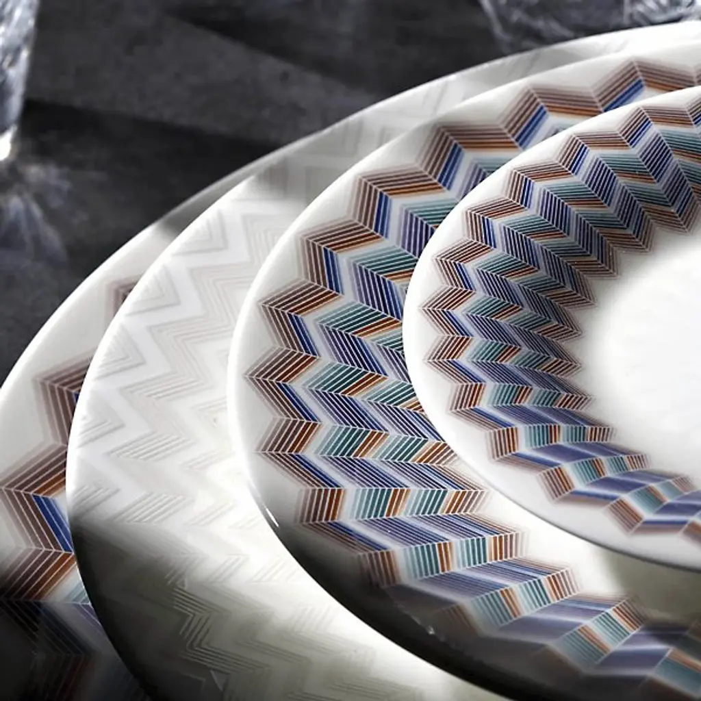 The Zig Zag Bread and Butter Plates, Set of 6 from Missoni provide vibrant, engaging energy to any table with their signature zigzag pattern dancing around the rim. Bold colors and refined angles contrast beautifully against the pale center, adding an intricate twist to the modern design. Fashioned from durable bone china and tough enough to be dishwasher safe, these plates are equally applicable to everyday dining and special gatherings.