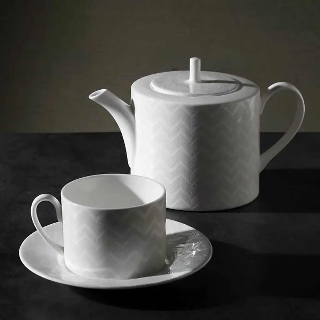 The Zig Zag Tea Cup & Saucer, Set of 6, from Missoni brings a bold twist to tea time with its iconic zigzag pattern, a hallmark of its design legacy since the 1960s. Vibrant, rhythmic zig zag lines create a sense of movement, adding a playful yet refined touch. Each element is made from bone china; this set is dishwasher-safe and microwave-friendly, except for gold-accented designs.