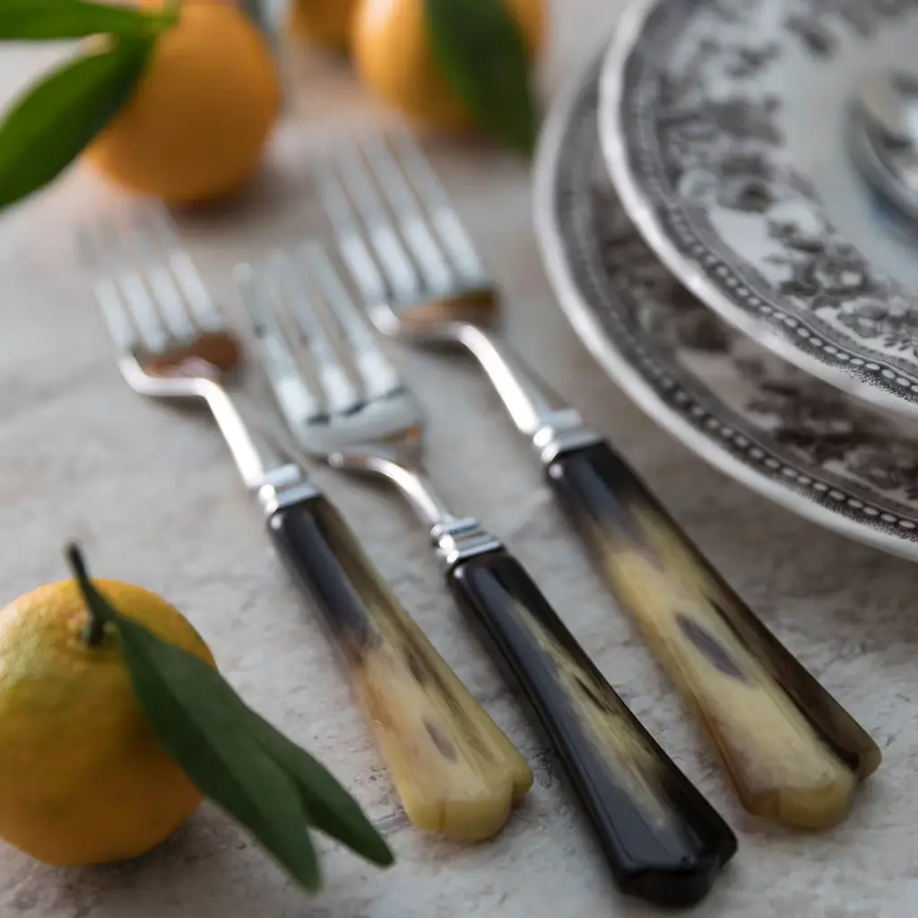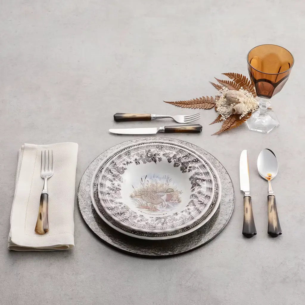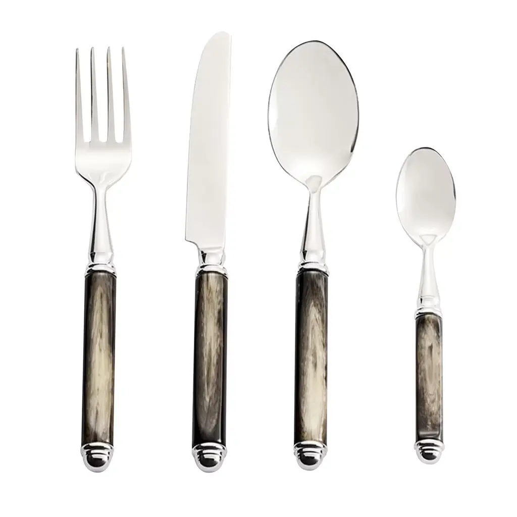 A charming combination of classic and contemporary styles, this cutlery set of six pieces for one table place will make a refined addition to any refined dining table. Fashioned of Meba Bioresine, a certified sustainable bio-based resin, the sleek classic lines of each handle matches the delicate shapes of the handcrafted steel upperparts. This set comprises one fork, one spoon, one knife, a fruit fork and knife, and one coffee spoon. It comes with a velvet cutlery holder.