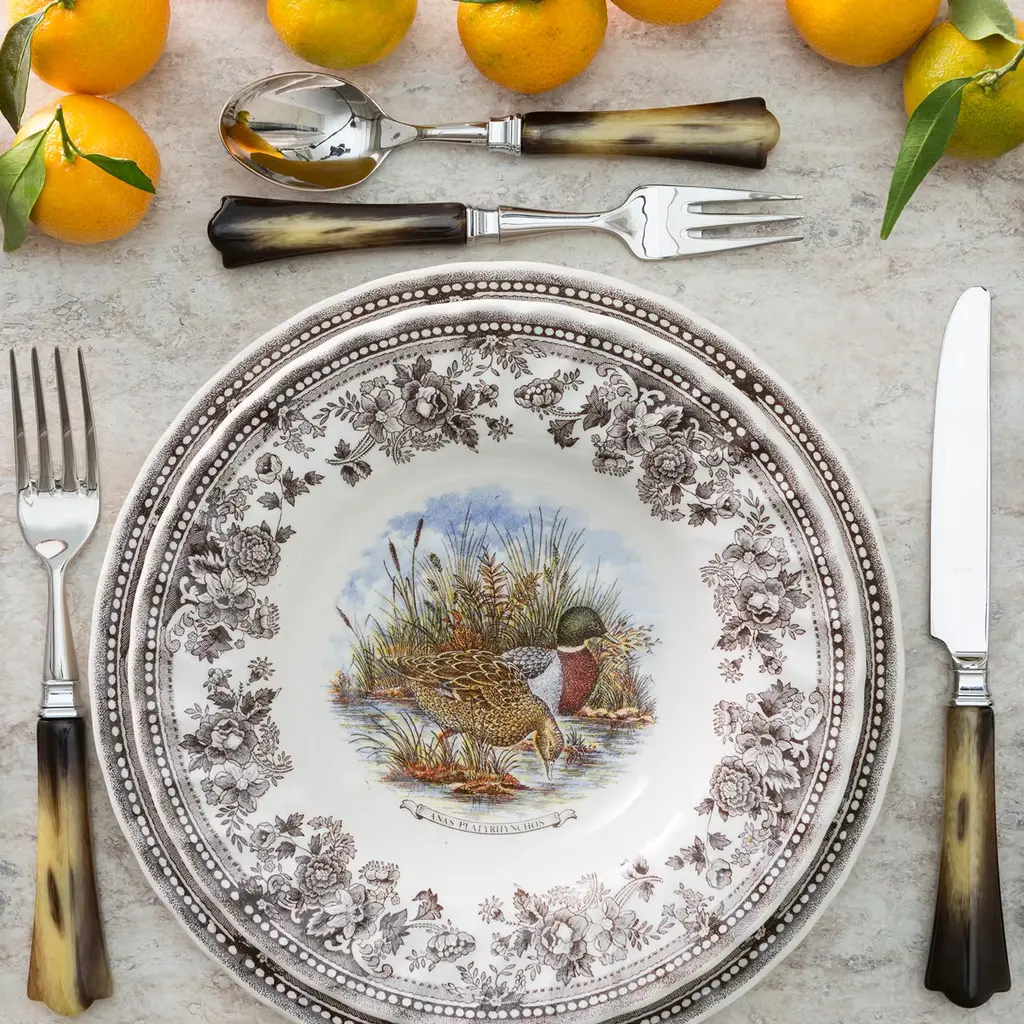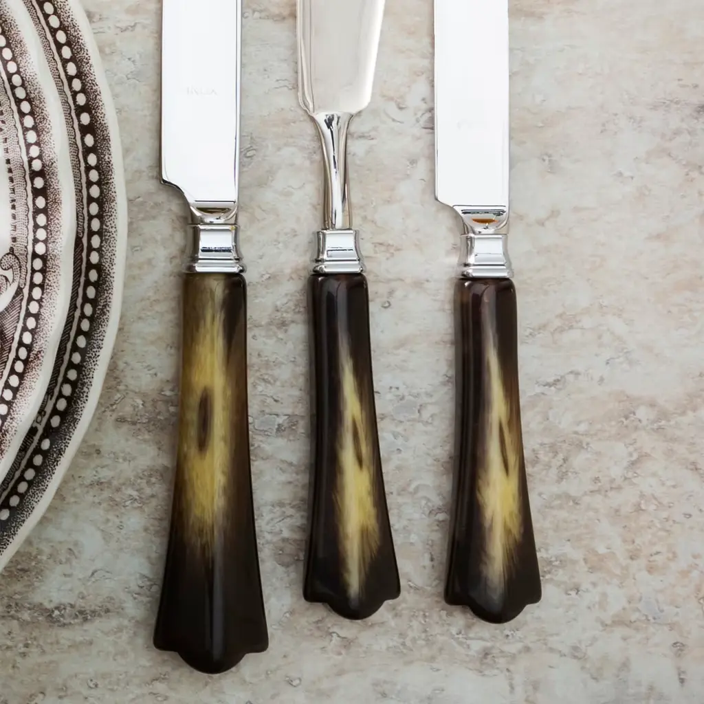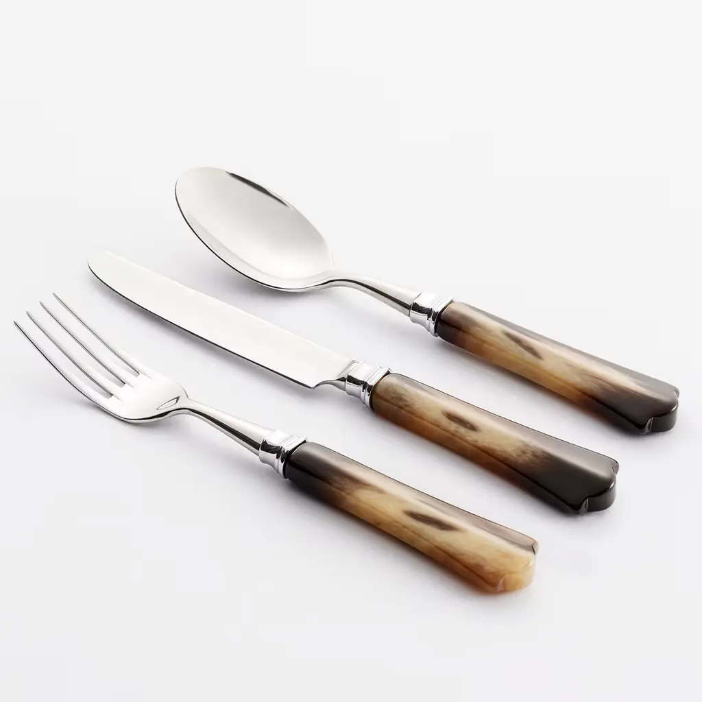 A charming combination of classic and contemporary styles, this cutlery set of six pieces for one table place will make a refined addition to any refined dining table. Fashioned of Meba Bioresine, a certified sustainable bio-based resin, the sleek classic lines of each handle matches the delicate shapes of the handcrafted steel upperparts. This set comprises one fork, one spoon, one knife, a fruit fork and knife, and one coffee spoon. It comes with a velvet cutlery holder.