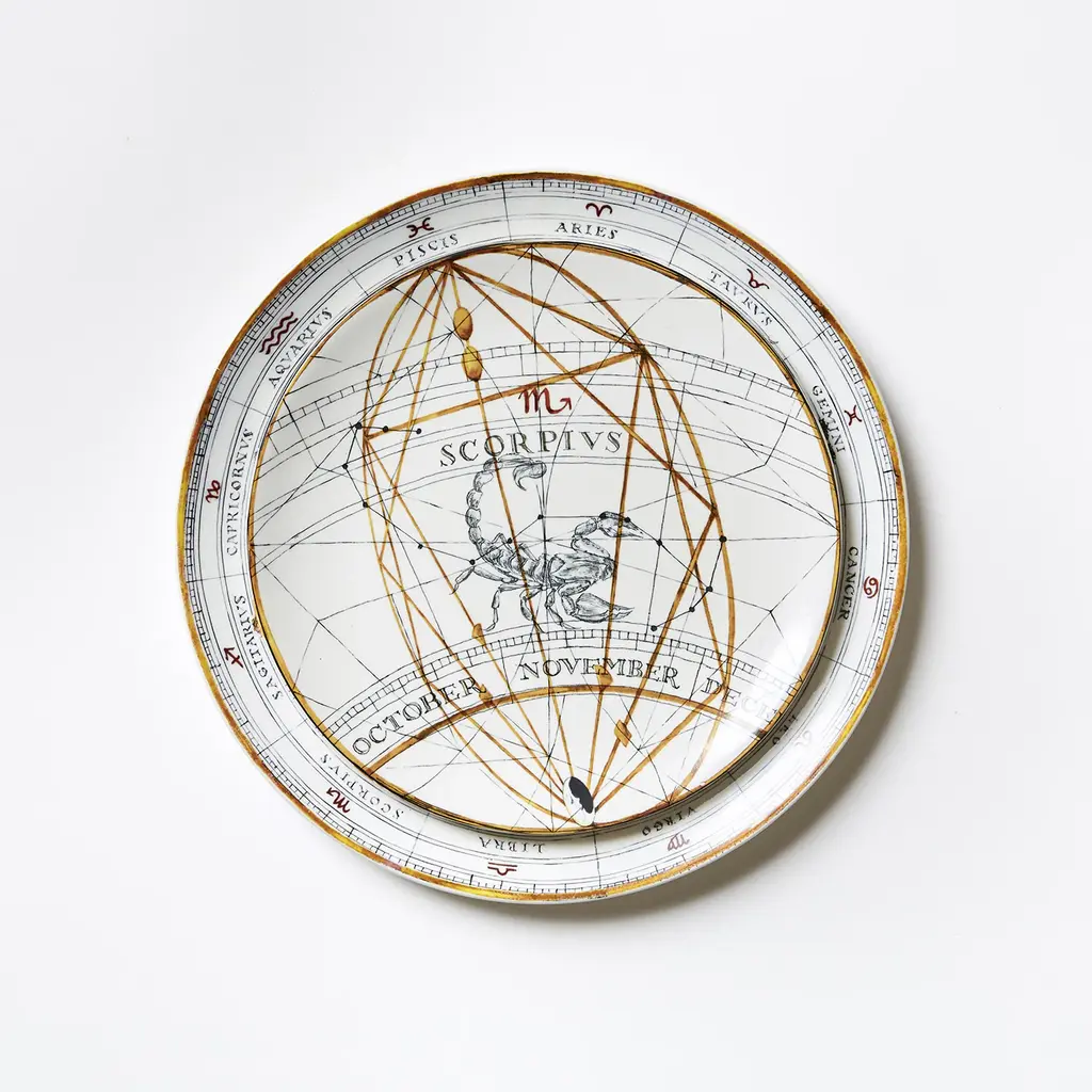 The twelve signs of the Zodiac navigate the astral geography along with their celestial coordinates, and a thirteenth element brings them together in a complete circle on the edge of the plate. Embellished with stellar gold patterns, they are an irresistible attraction for astrology enthusiasts, those who love the stars, and those who do not read horoscopes but are fascinated by the sky and the night.