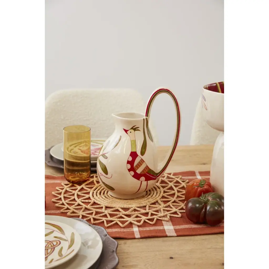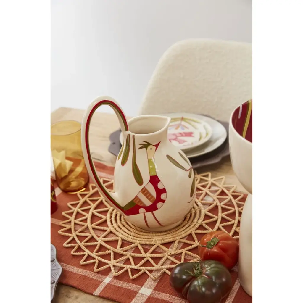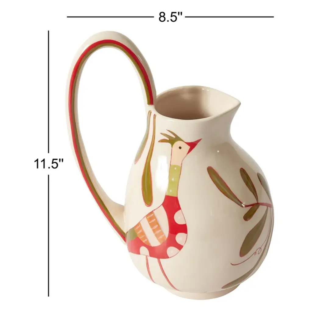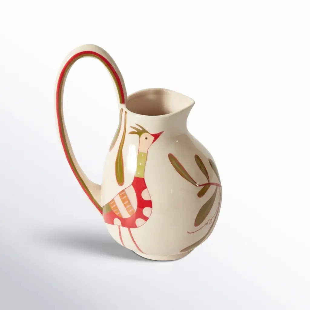 Artist Jessica Hiemstra livens up any table with her folk art-inspired creations and mix of color and pattern. The hand-painted parable pitcher is full of personality with a flourishing bird and nature design on the cream background. Use this decorative piece with a beverage or as a vase with fresh stems.