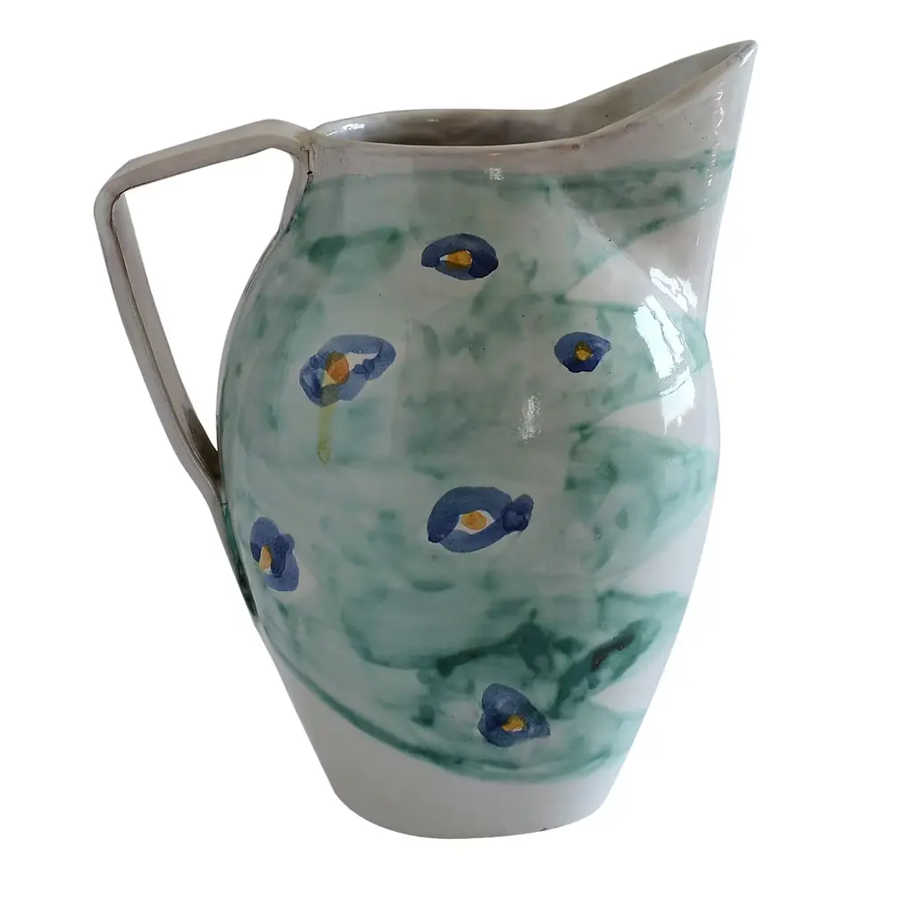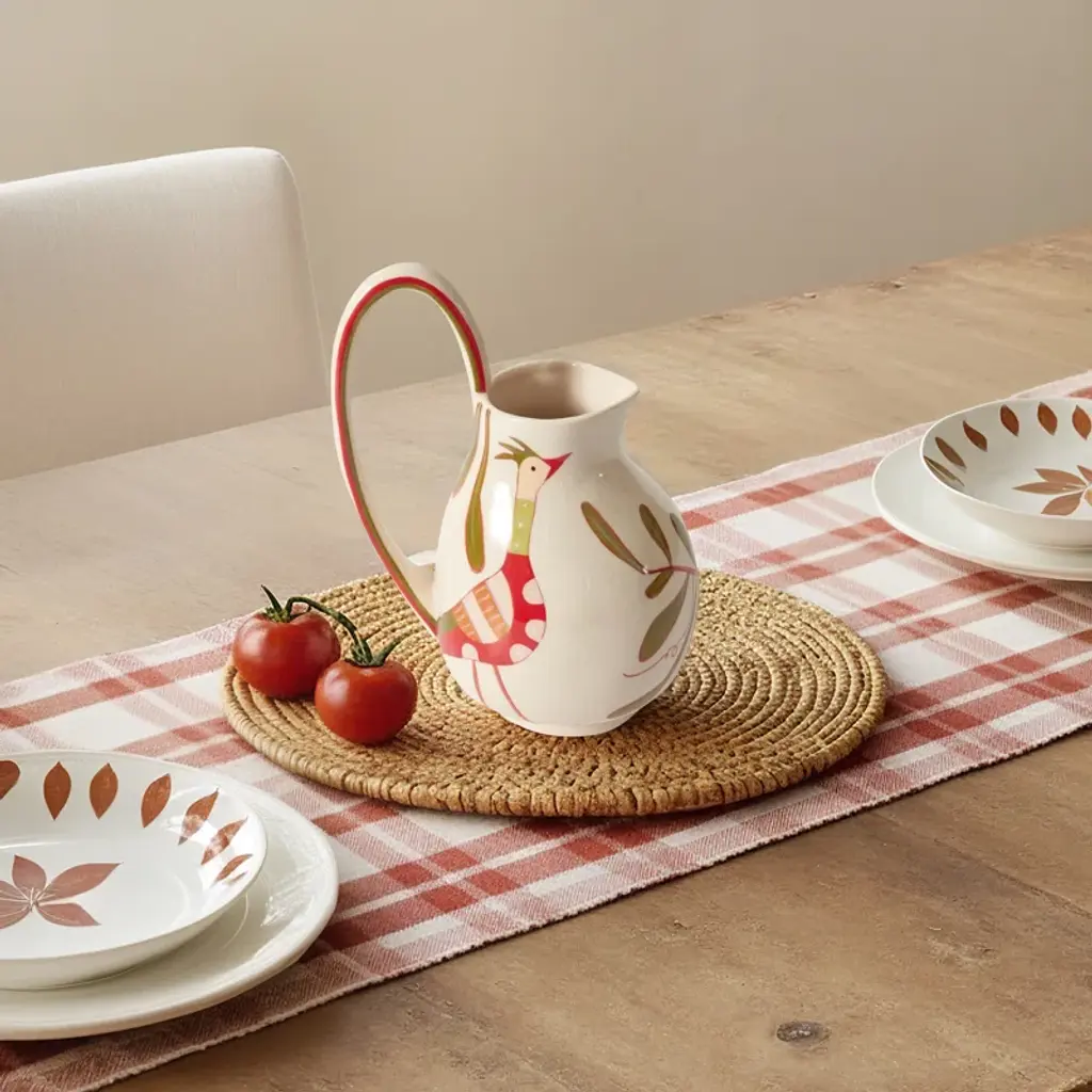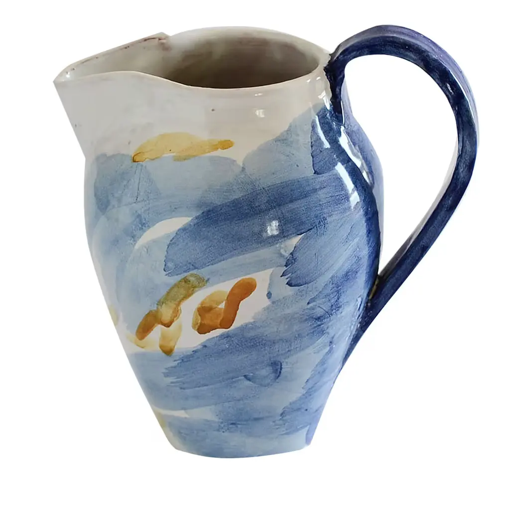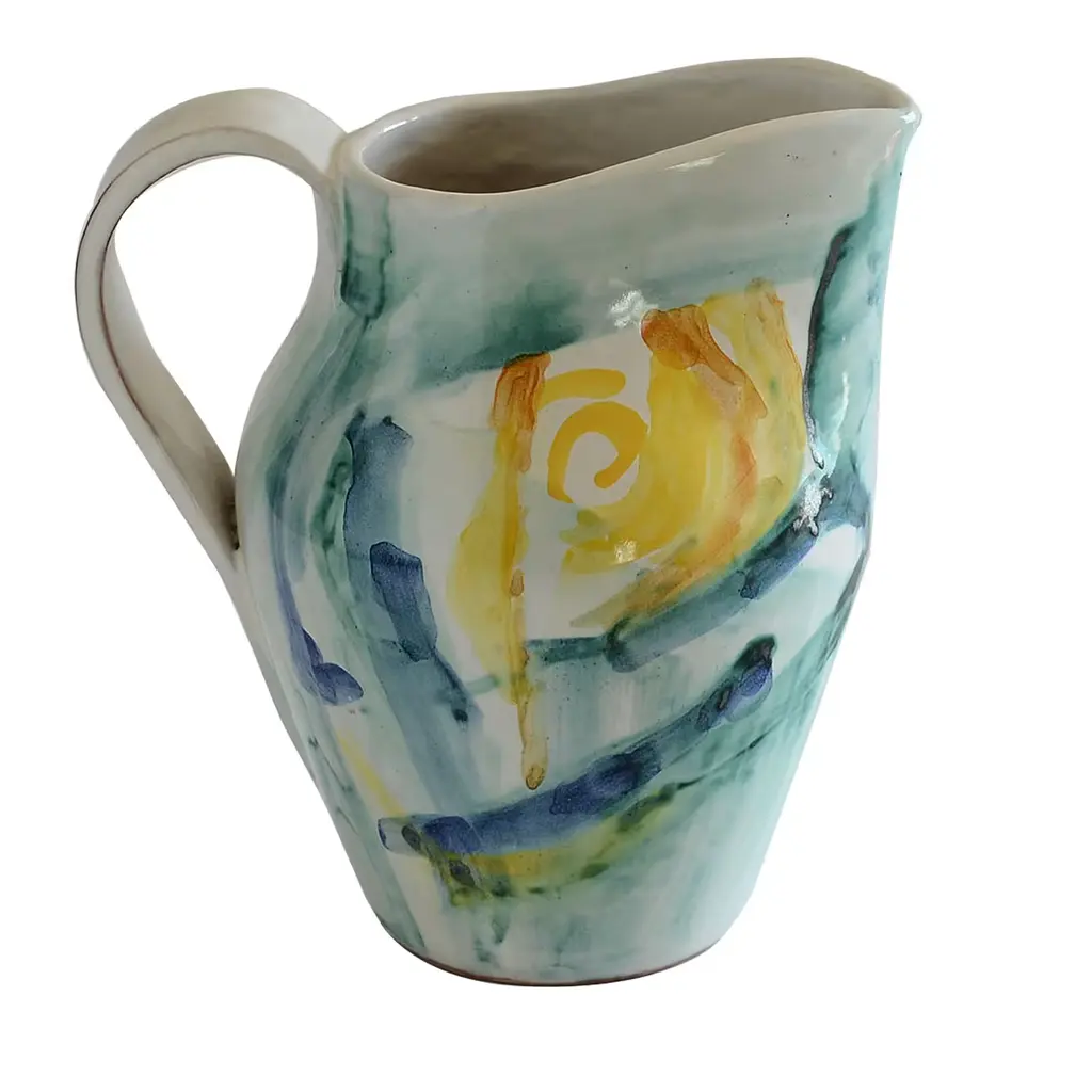 Artist Jessica Hiemstra livens up any table with her folk art-inspired creations and mix of color and pattern. The hand-painted parable pitcher is full of personality with a flourishing bird and nature design on the cream background. Use this decorative piece with a beverage or as a vase with fresh stems.
