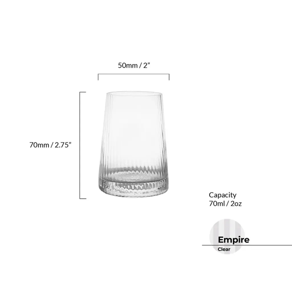 Enjoy your favorite shots with the set of 4 Zoya Clear shot glasses from Empire Collection. These glasses are designed with a contemporary-shaped bowl with rounded corners and a fine optic design, coupled with a robust structure. Each glass is mouth blown and handmade by skilled craftsmen. Gift-boxed and hand wash recommended, these shot glasses make for a stylish addition to your bar.