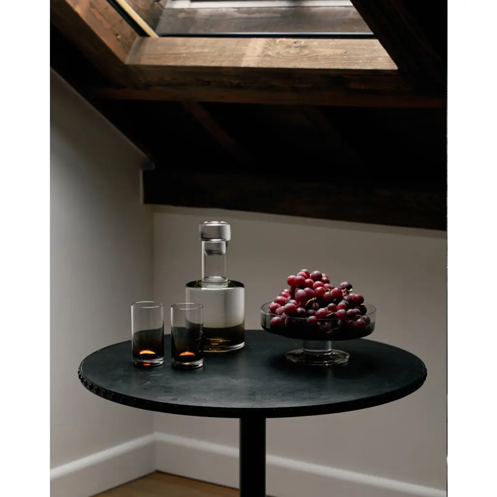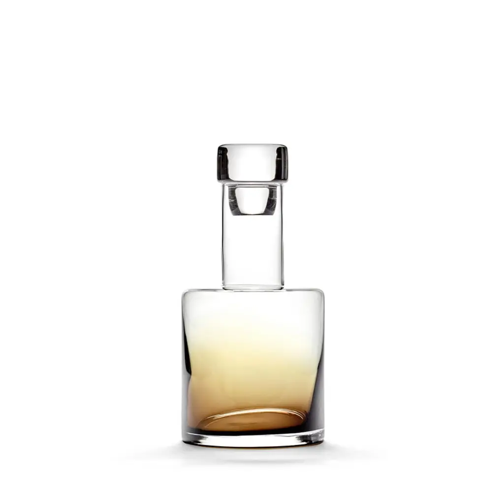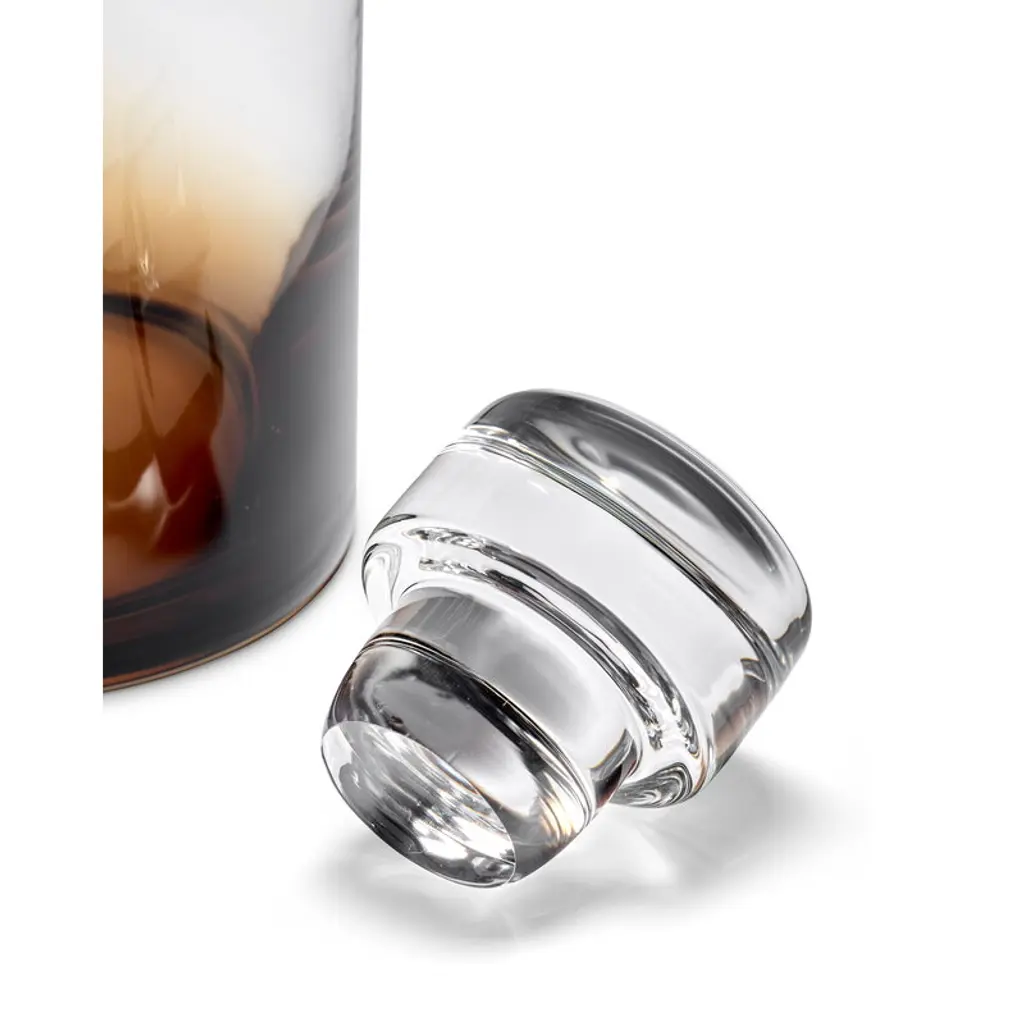 Serax's Zuma glass carafe pairs a clear upper part with a warm amber-hued lower half. This beautiful gradient effect is achieved by mouth-blowing three layers of glass mass, with an amber hue injected into the middle one. The Zuma carafe, topped with a glass stopper, holds 1.55 liters and is ideal for serving water as well as both everyday and festive drinks. Kelly Wearstler's Zuma collection is a harmonious blend of porcelain tableware and elegant glassware, all sharing earthy tones and an ergonomically pleasing design. The different colors and patterns in the Zuma collection seamlessly complement each other, making mixing and matching a delightful possibility.