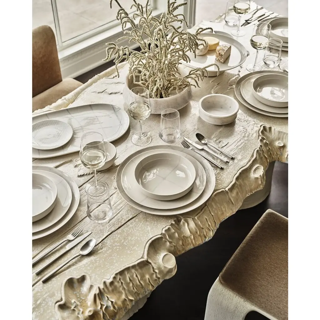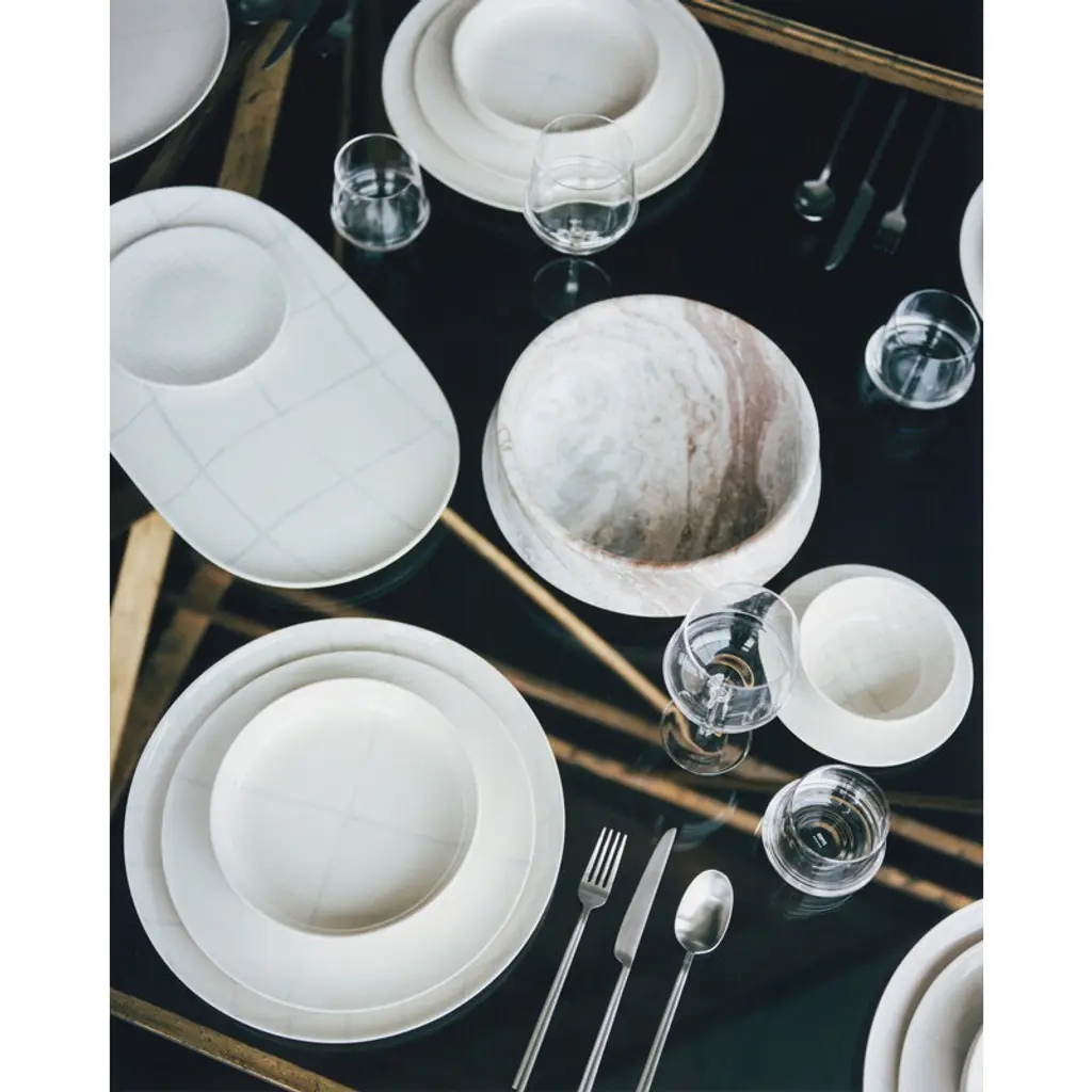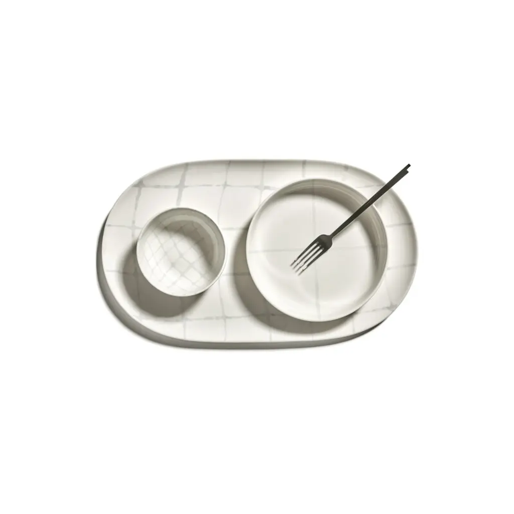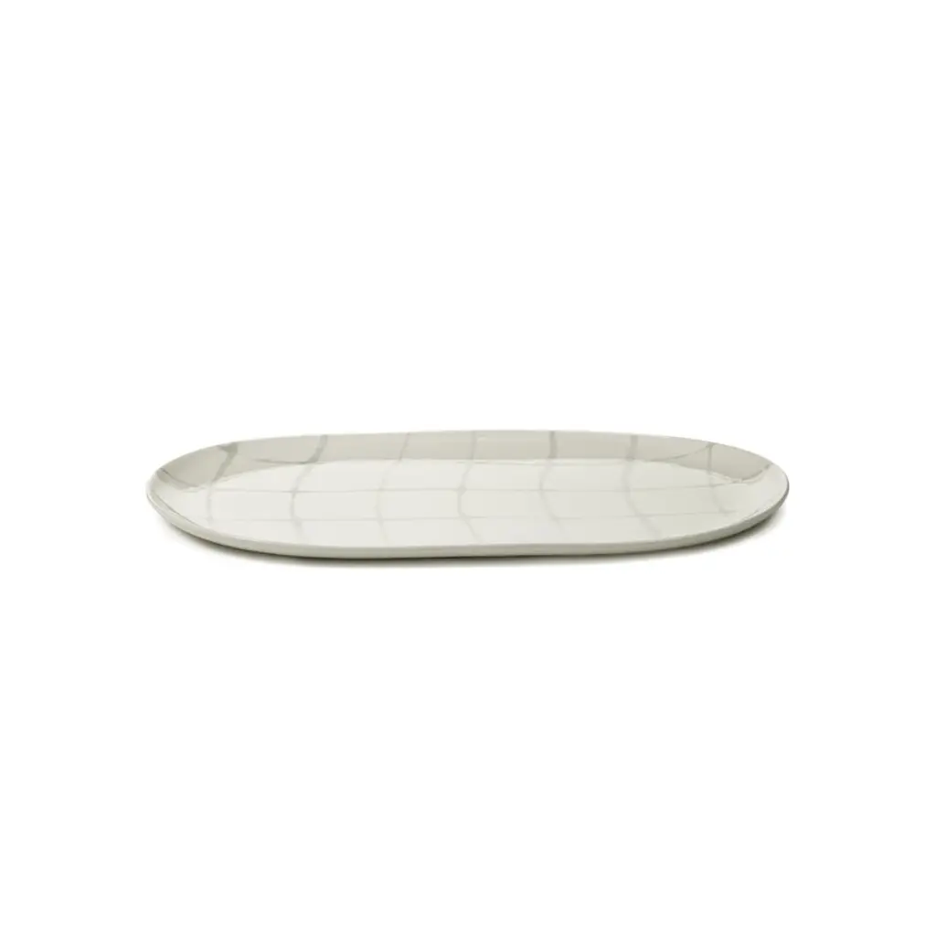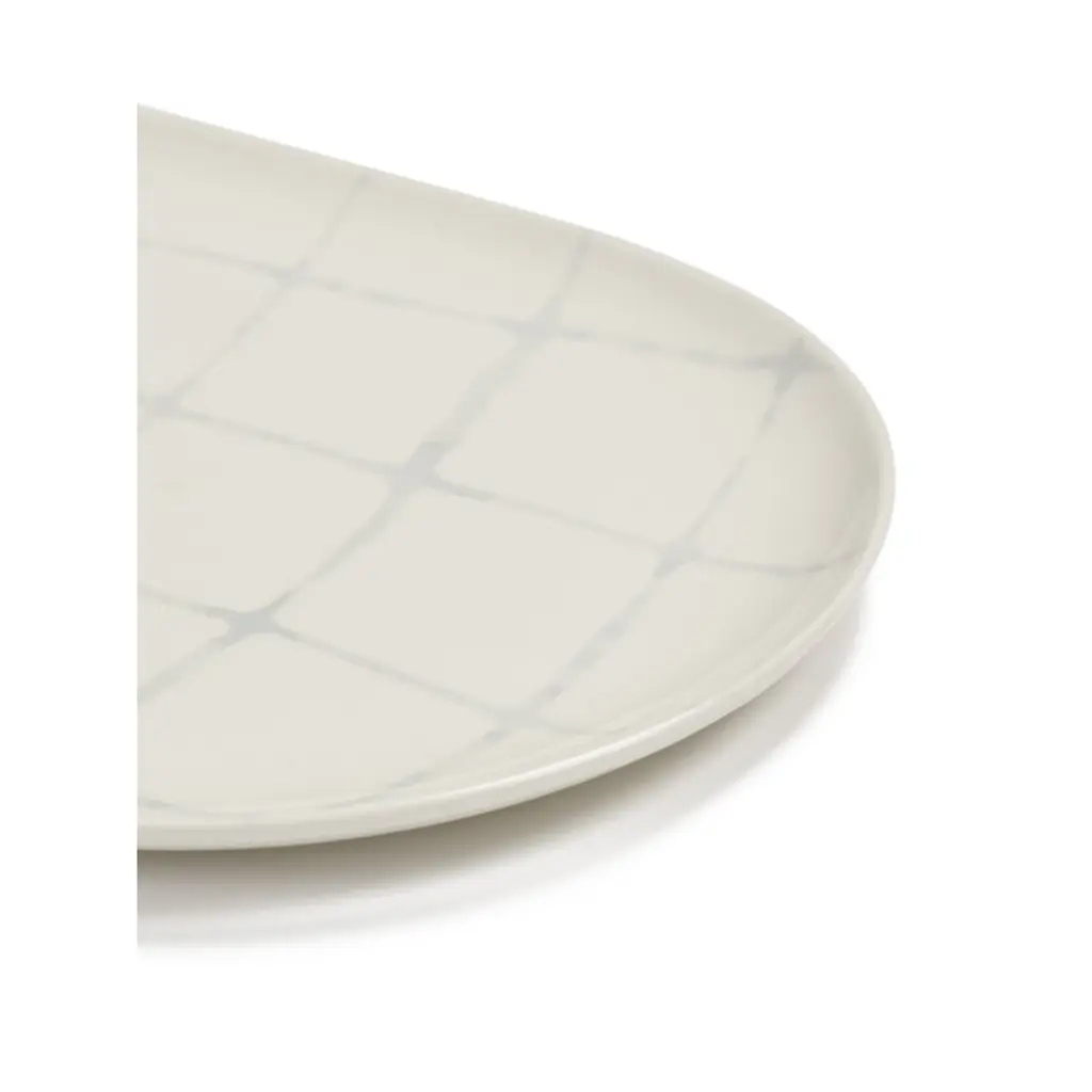 Serax's Zuma serving dish boasts a delicate, geometric line pattern inspired by the minimalist design principles of Bauhaus. The hand-stamped porcelain plate has been finished with a glazing. The generously sized Zuma serving dish is suitable for roasts, fish, or various assortments of tapas, cheese or sushi, in both everyday dining and special occasions. Kelly Wearstler's Zuma collection is a harmonious blend of porcelain tableware and elegant glassware, all sharing earthy tones and an ergonomically pleasing design. The different colors and patterns in the Zuma collection seamlessly complement each other, making mixing and matching a delightful possibility.