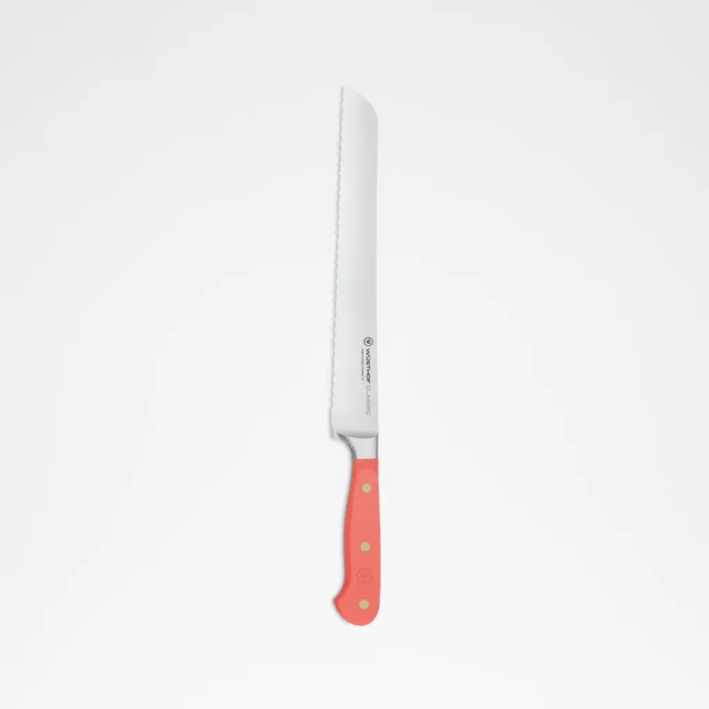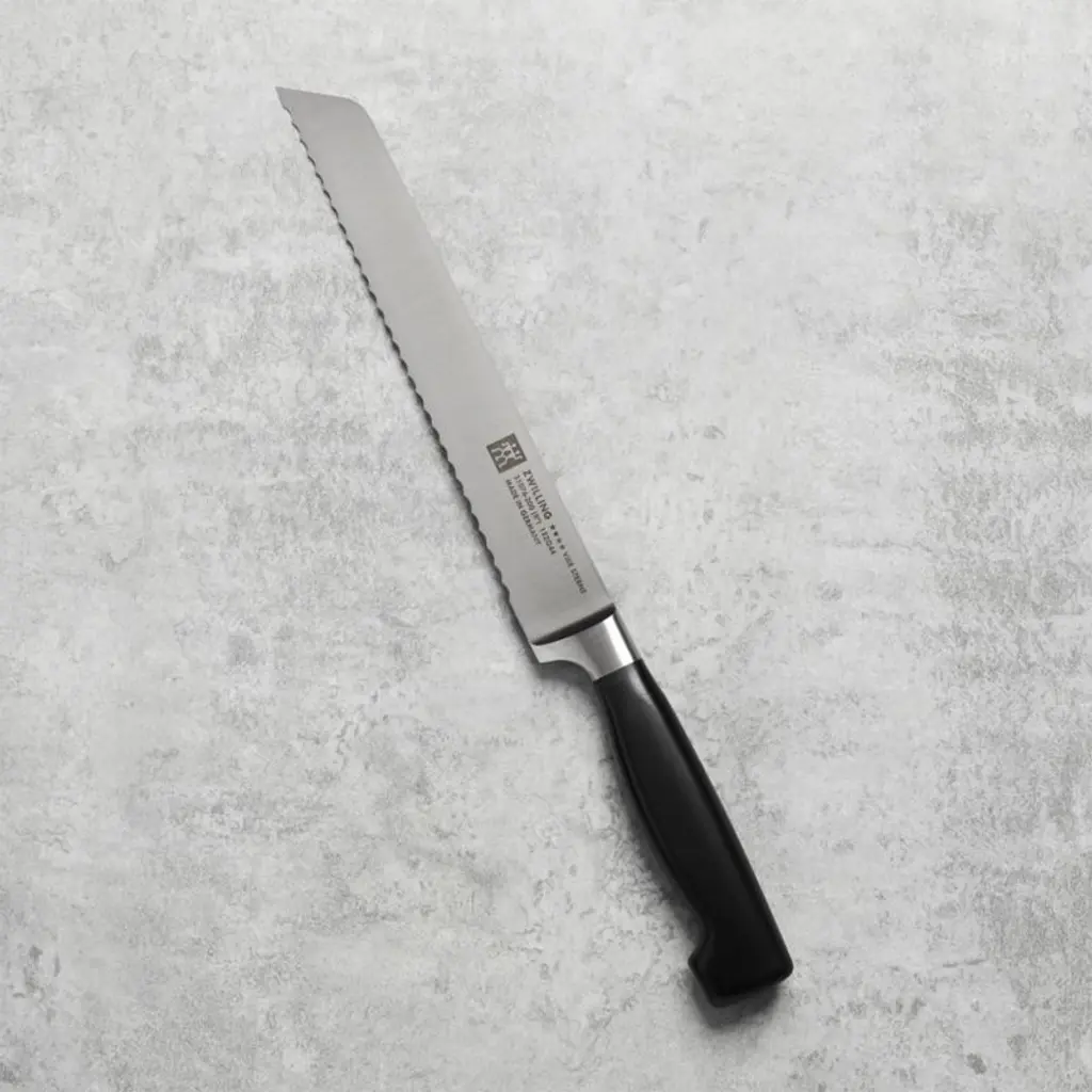 Ably slicing through thick-crusted country loaves and crispy baguettes, this bread knife also easily slices thick-skinned produce and cuts cakes into layers. The long, serrated blade saws smoothly without crushing. Forged from a single piece of high-carbon stainless steel, the blade is ice-hardened for durability and given a laser-controlled edge for long-lasting sharpness. The seamless ergonomic black handle provides a comfortable grip as you cut.ZWILLING of Germany has been crafting fine blades for nearly three centuries.