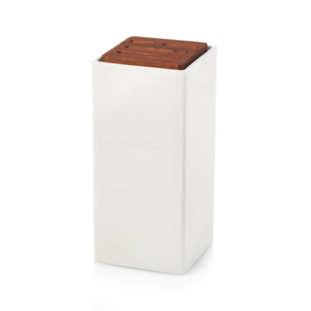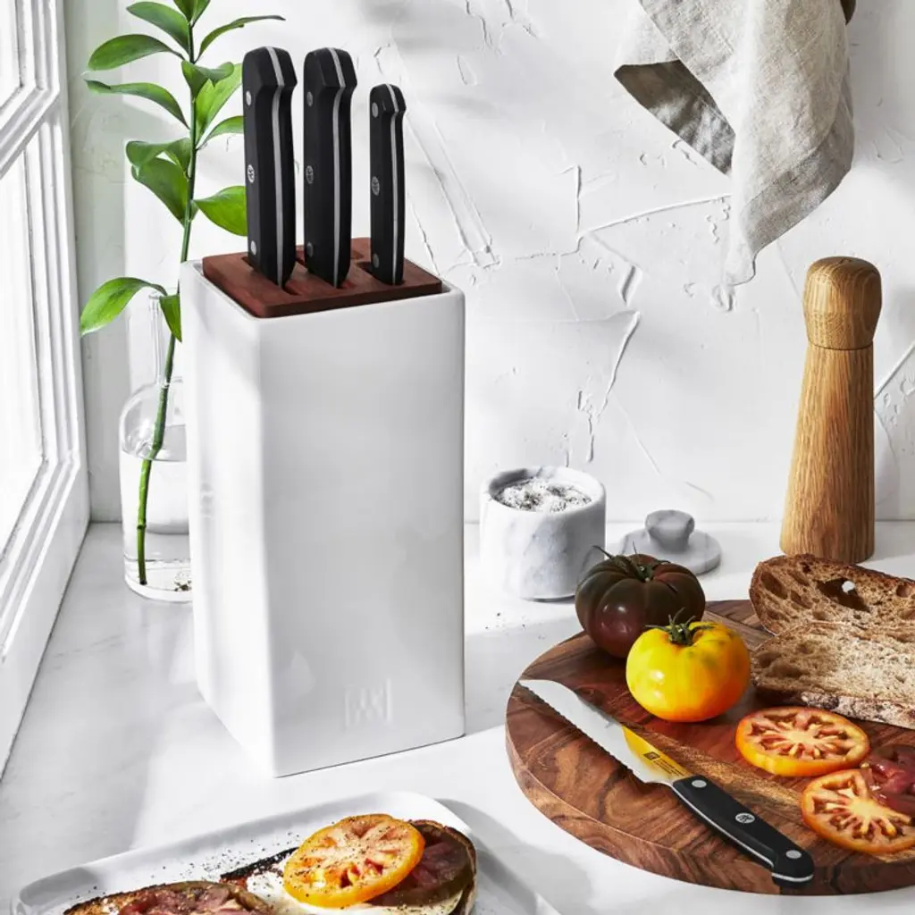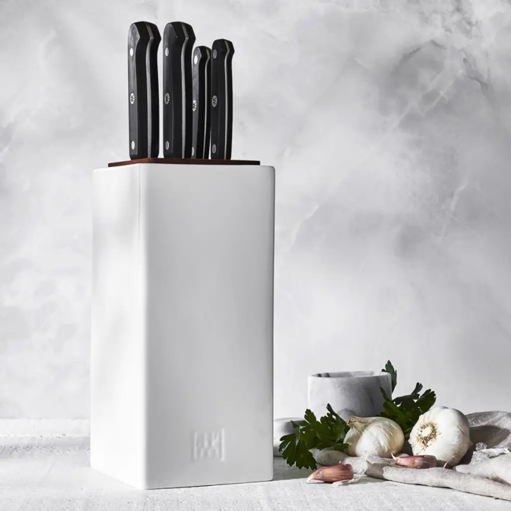 Four essential high-carbon stainless steel knives stay at the ready in a lovely white canister. Each full-tang blade is stamped from a single piece of steel, ice-hardened and joined with a triple-riveted black handle. The block pairs a ceramic canister glazed creamy white with a richly hued wooden top. Carved out of richly hued sapele wooda botanical relative of mahoganythe lid offers a slot for each of the knives. An ideal wedding, housewarming or graduation gift, the set includes an 8" chef's knife, 8" bread knife, 5" utility knife and 4" paring knife in a block. This five-piece white canister knife set is a Crate and Barrel exclusive.ZWILLING J.A. Henckels brings to bear nearly 300 years of experience studying and crafting premium knives.View our Zwilling Cutlery comparison chart. Need help choosing? Here's your essential guide to choosing the best knife View all Zwilling J.A. Henckels products