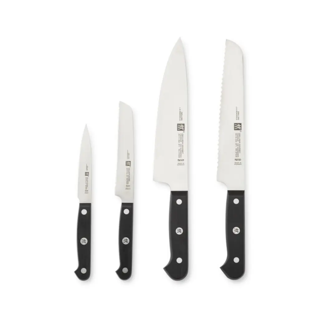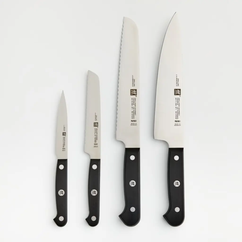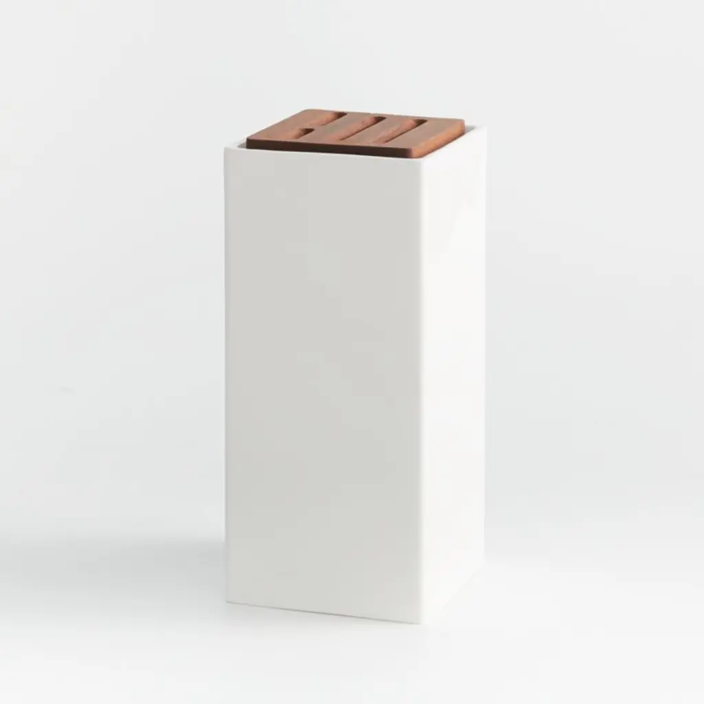 Four essential high-carbon stainless steel knives stay at the ready in a lovely white canister. Each full-tang blade is stamped from a single piece of steel, ice-hardened and joined with a triple-riveted black handle. The block pairs a ceramic canister glazed creamy white with a richly hued wooden top. Carved out of richly hued sapele wooda botanical relative of mahoganythe lid offers a slot for each of the knives. An ideal wedding, housewarming or graduation gift, the set includes an 8" chef's knife, 8" bread knife, 5" utility knife and 4" paring knife in a block. This five-piece white canister knife set is a Crate and Barrel exclusive.ZWILLING J.A. Henckels brings to bear nearly 300 years of experience studying and crafting premium knives.View our Zwilling Cutlery comparison chart. Need help choosing? Here's your essential guide to choosing the best knife View all Zwilling J.A. Henckels products