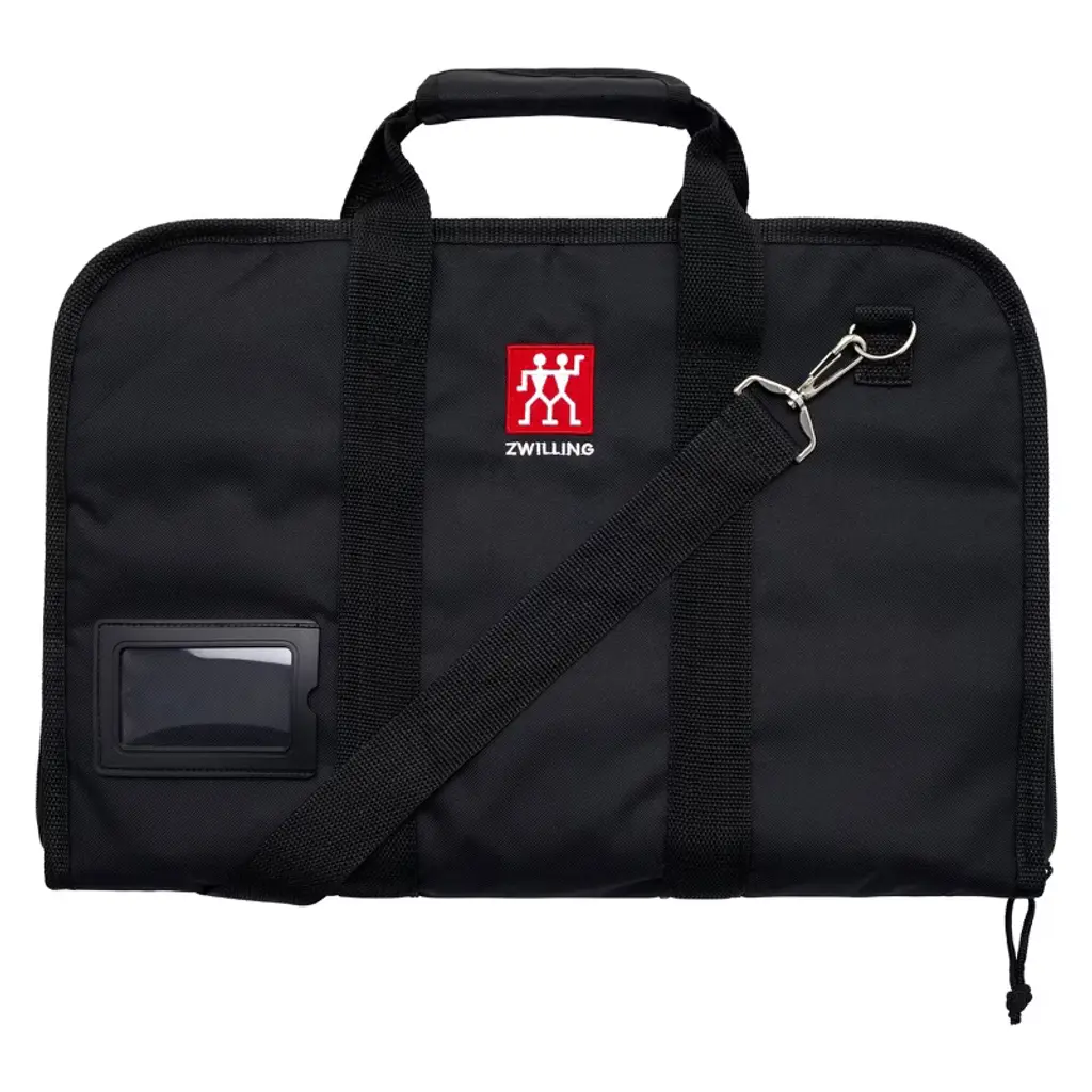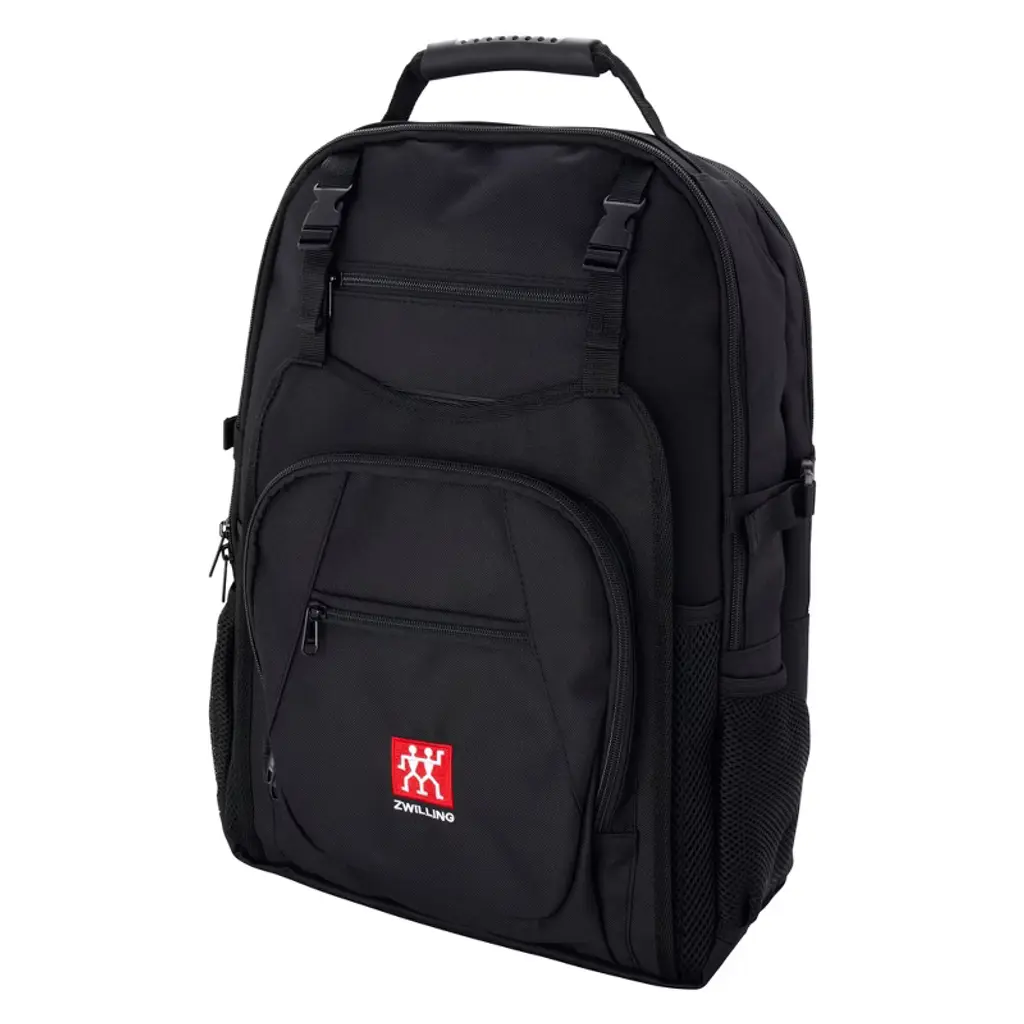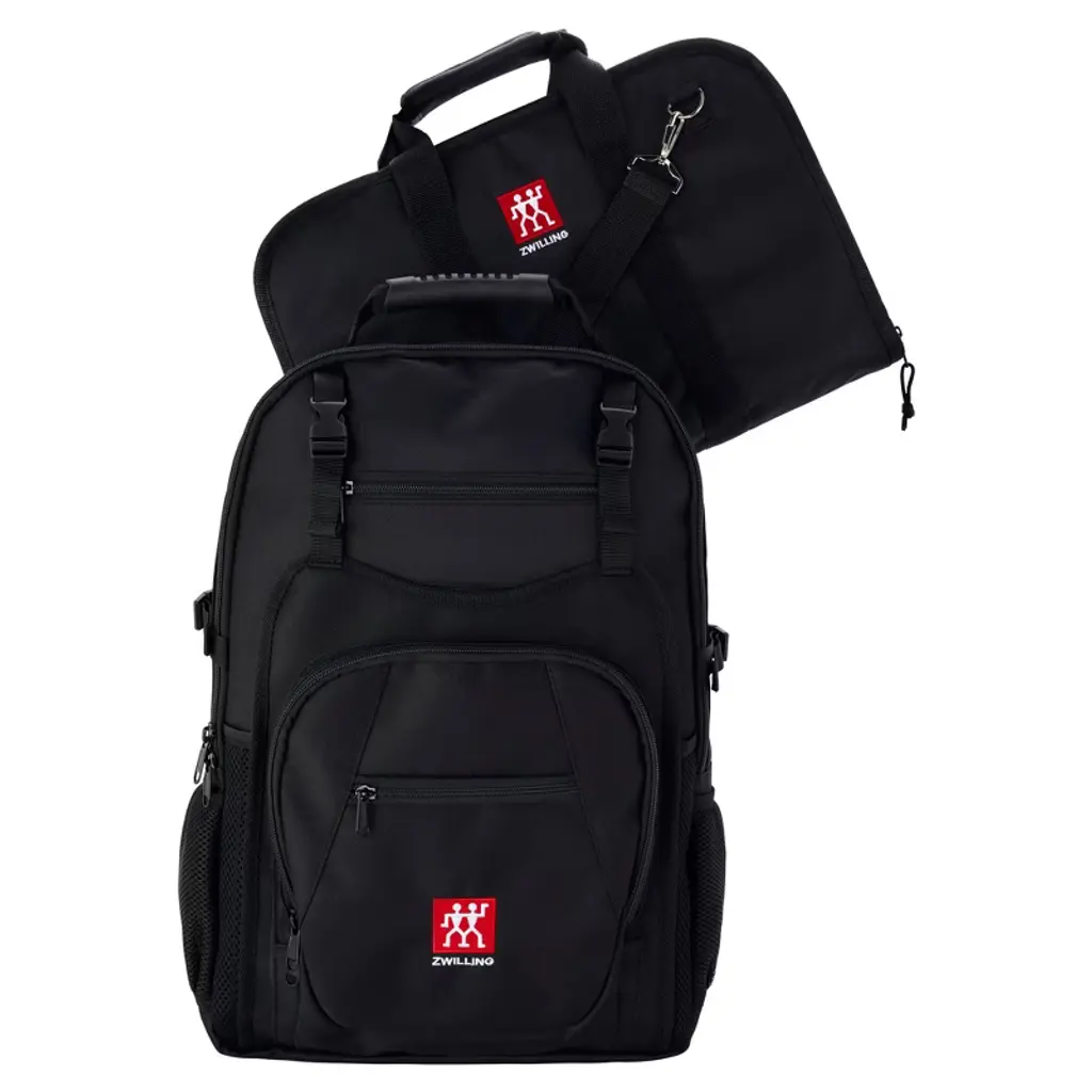 Take knives, books, laptops, and other essentials on the go in these compact carry cases,Perfect for culinary students, chefs, caterers, and even the home cook on the go, this 2-in-1 carrying set includes a comfortable backpack and a durable knife bag insert that lets you carry supplies with you. Beautifully finished with the ZWILLING logo, it’s the set that makes toting kitchen supplies safe and easy.The sturdy nylon backpack features a comfortable padded back and two adjustable shoulder straps. With two roomy compartments, you can fit the knife bag insert in one compartment and laptops, books, and folders in the second compartment, which boasts a handy safety strap to secure your valuables. Two side pockets fit common-sized water bottles and 2 small front pockets are ideal for pencils and pens, phones, and wallet items.The set is rounded out by a knife bag that can be tucked into the backpack or toted on its own using the long crossbody strap or short handle. It safely and securely holds 10 knives that measure up to 10-inches in blade length and features a small compartment for utensils and a slot to slip in an ID tag.