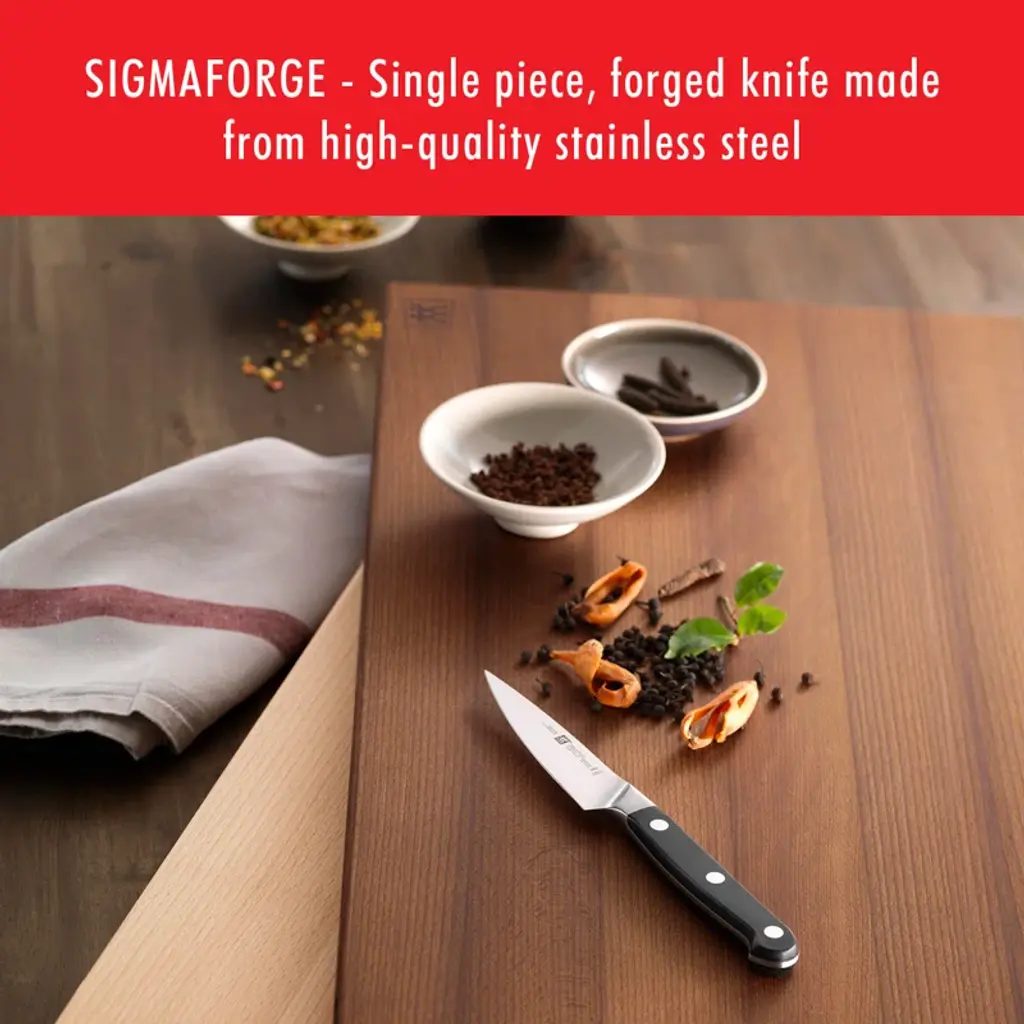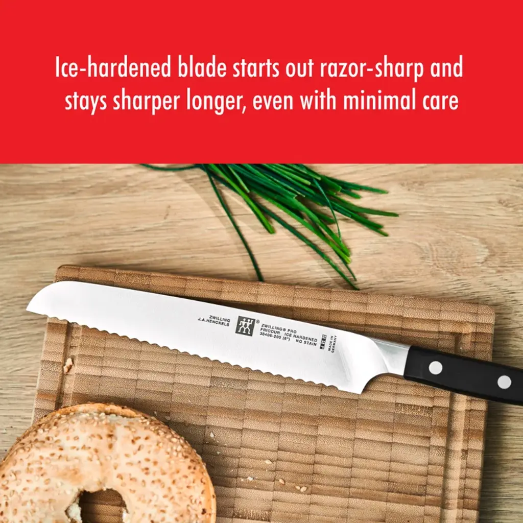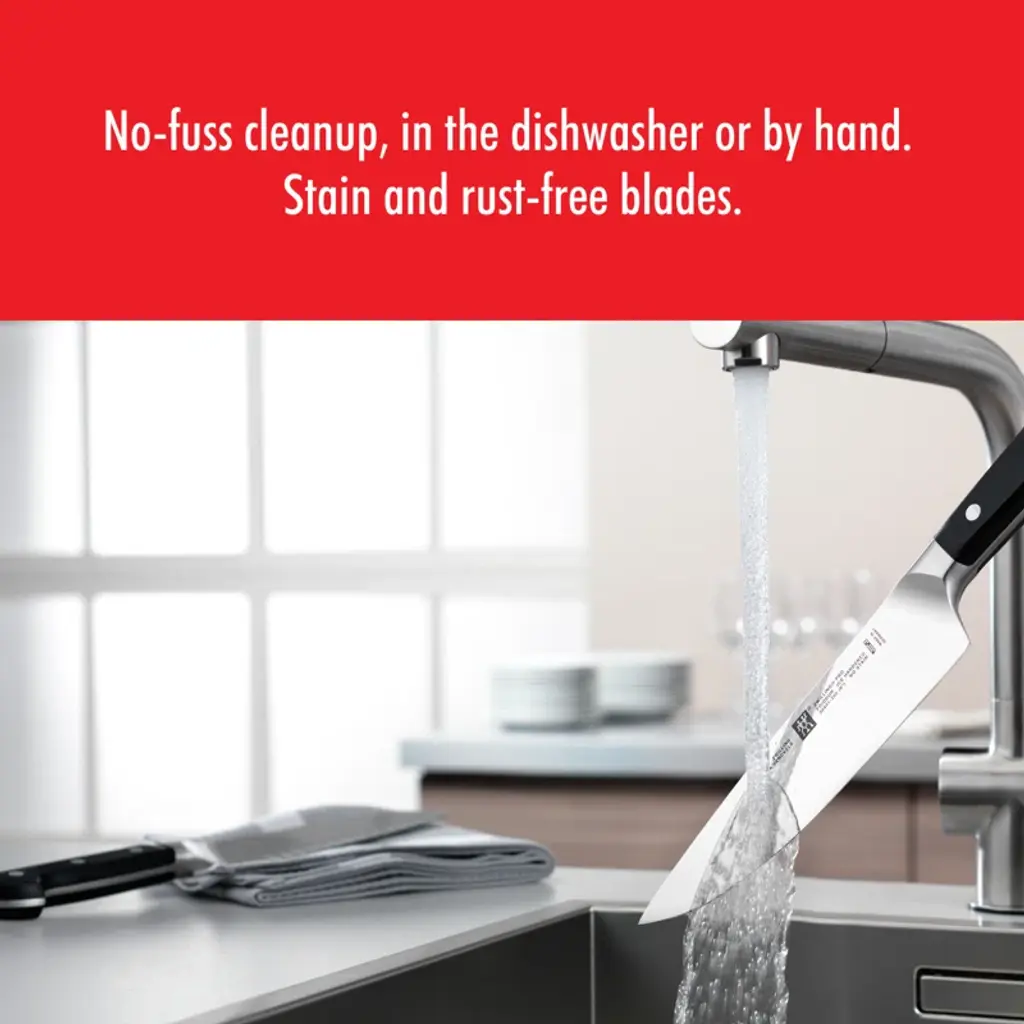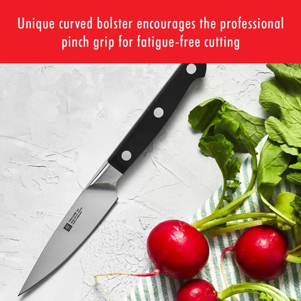 Zwilling Pro is the most user-friendly knife available to the market. The unique blade shape and ergonomic bolster are the results of 280 years of experience in knife making, and the rigorous study of how knives are used. A unique curved bolster supports the professional pinch grip, with the thumb and index finger on the blade, for safe cutting and less fatigue. The chef's knife blade was redesigned with a broader curve in the front to facilitate the rocking motion of Zwilling Ja henckelsstern cutting, while the straight back is ideal for the Asian chopping motion. The full length of the blade can be used when cutting and can be sharpened from bolster to tip.