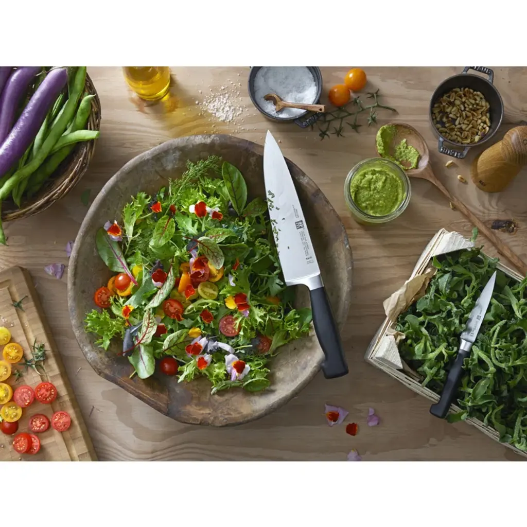 Four Star is the top-selling knife series of Zwilling J.A. Henckels worldwide. Honed and hand-finished by the most skilled artisans, this celebrated collection is the model of safety, ergonomics, and comfort. Thanks to their seamless transition from bolster to handle, the knives are comfortable to use for long periods of time. The bolster provides the right balance while acting as a safe finger guard. The knives are made of proprietary special formula steel that has been perfected for over 280 years. Combined with Zwilling's signature ice-hardening technique, these Friodur blades are harder and sharper, they will not stain or chip and they retain their sharpness longer. Precision-forged from a single piece of steel, the Sigmaforge knives have an exceptionally sturdy, balanced, and flexible blade.