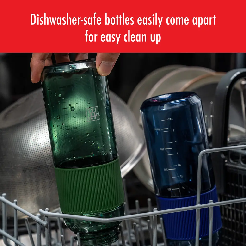 Stay Hydrated, On the Field and On the GoWhether you’re hiking the hills, heading out to work, or kicking the ball around the field, these colorful water bottles are the perfect companion, keeping you hydrated on the go. Made of durable, BPA-free Tritan plastic, they are lightweight, odorless, and won’t affect the taste of water or any other refreshing drink you fill them with. And with a secure safety lock, you never have to worry about accidental openings.The ZWILLING Water Bottles feature a host of thoughtful design features, including a convenient one-hand open and close mechanism, a silicone sleeve that ensures a comfortable, secure grip, a diameter that ensures a perfect fit in most car cup holders, and a handy strap for easy toting. Also included with the bottle is a removable strainer to keep ice and flavorings like lime and lemon away from the spout when you are drinking.Available in 5 rich hues, you can choose a color for each member of the family. Dishwasher safe removable parts make clean up a cinch.