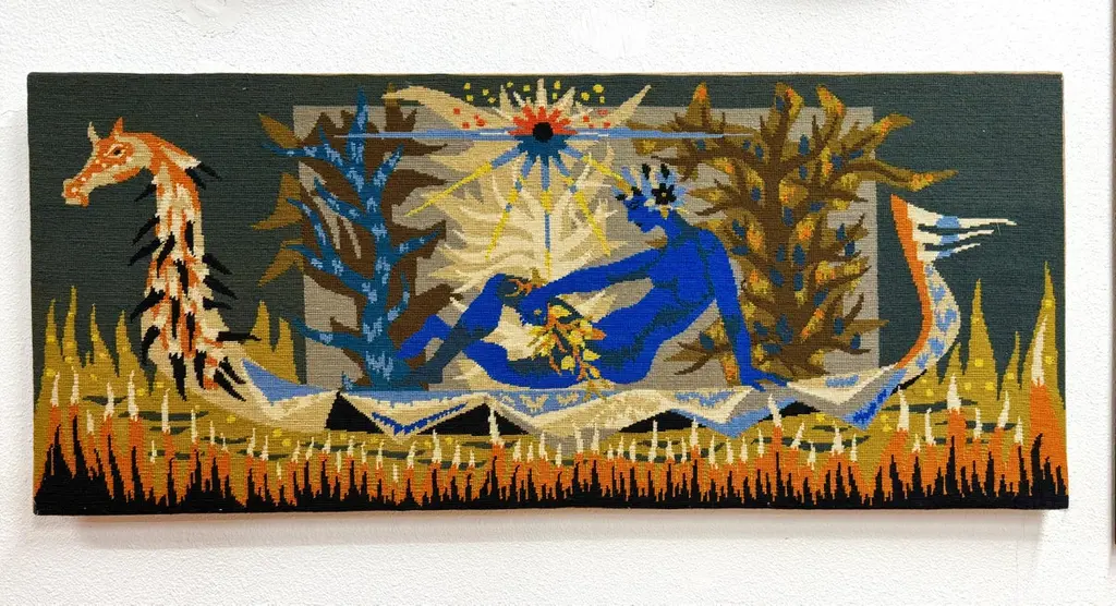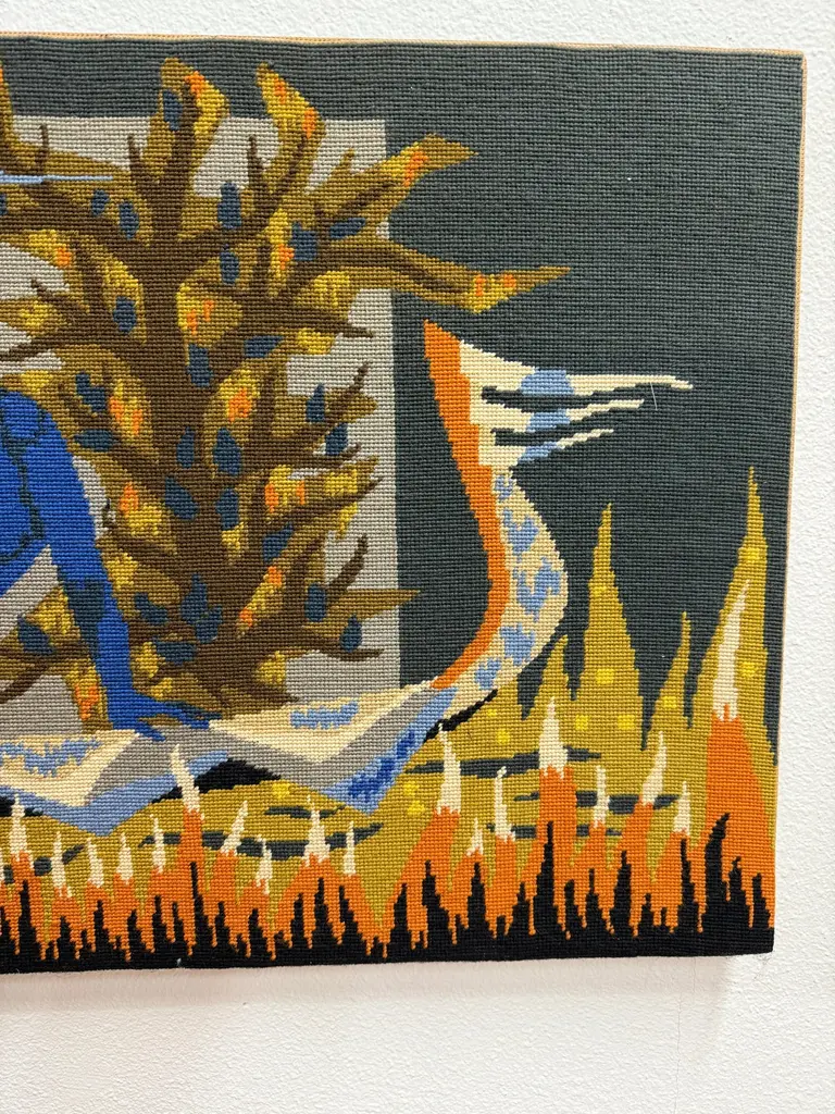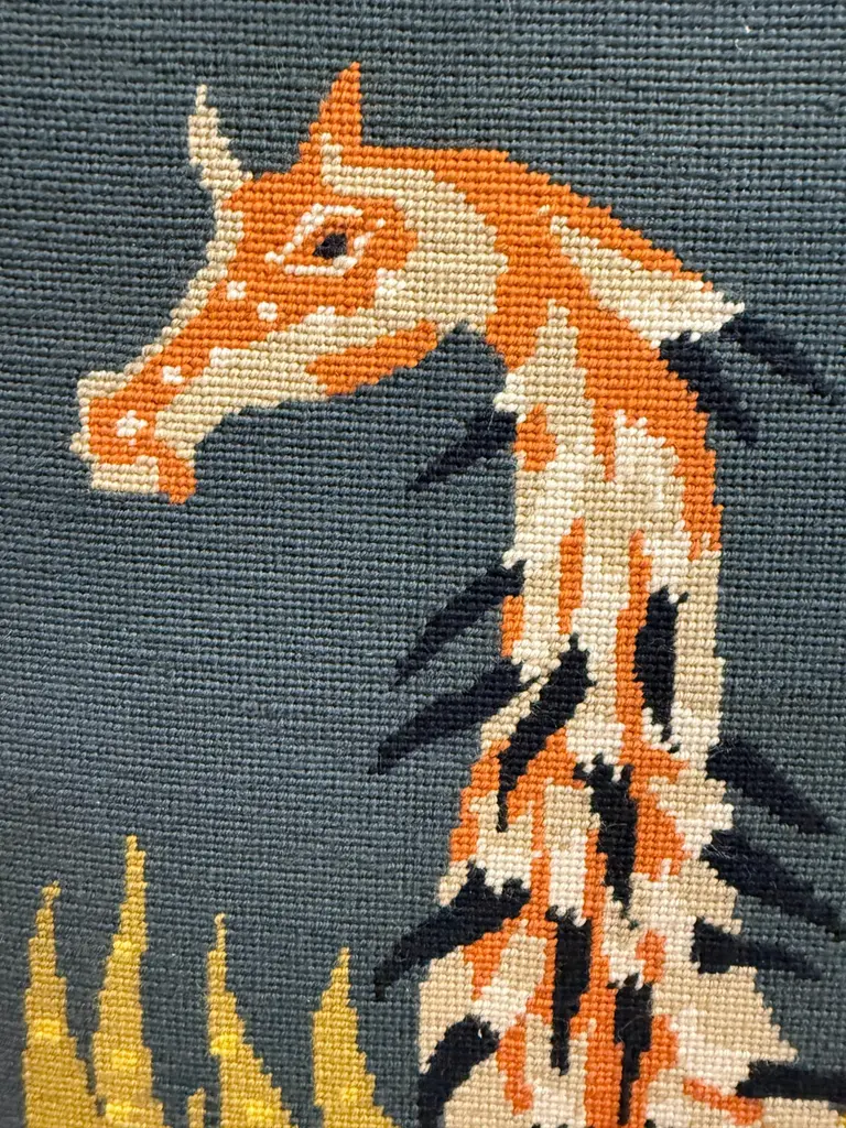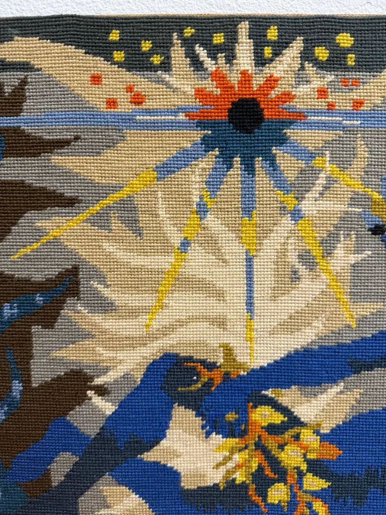 A lovely colorful tapestry titled on the back “La Barque De L’Ondine” which roughly translates to the boat of Ondine, the Water Nymph. There are many myths and stories surrounding the water nymph Ondine or Undine. This pretty piece is mounted on board. It is in good condition with some minor wear and imperfections. Please see the detailed photos.