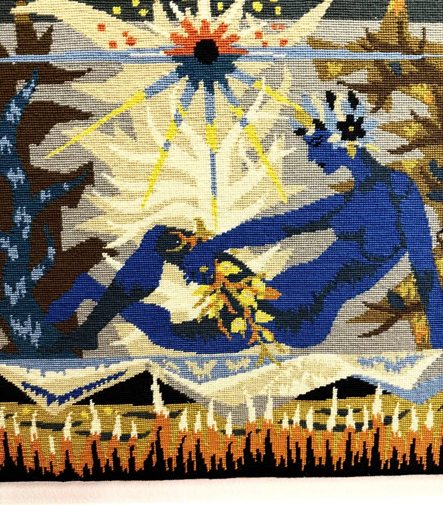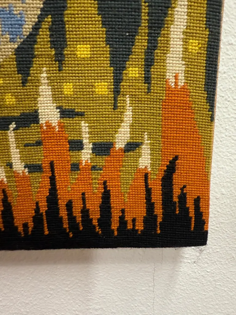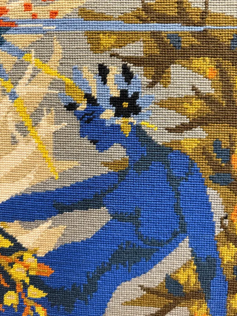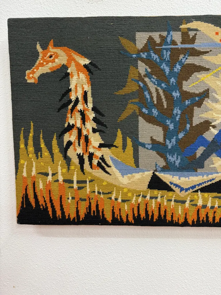 A lovely colorful tapestry titled on the back “La Barque De L’Ondine” which roughly translates to the boat of Ondine, the Water Nymph. There are many myths and stories surrounding the water nymph Ondine or Undine. This pretty piece is mounted on board. It is in good condition with some minor wear and imperfections. Please see the detailed photos.