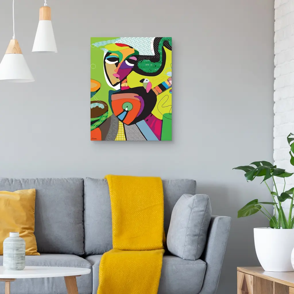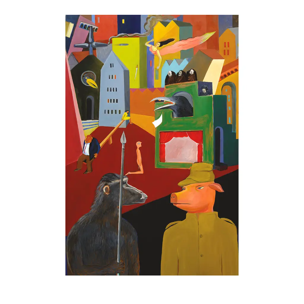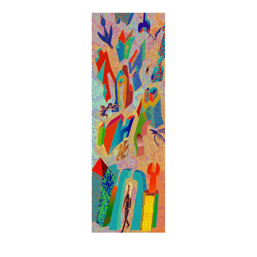 Named after the portmanteau of the Italian names Abraham and Agamemnon - male characters from different mythological traditions who were both asked to sacrifice their children - this tapestry is an ironic, visionary reinterpretation of those myths. Vibrant colors add further personality to the subject, where a half-bird half-man creature (Abramennone) is depicted wielding a sword. Is he taking an oath or threatening gods? The piece will be ideally fitted to ceilings, more functional to let its light filtering quality emerge.