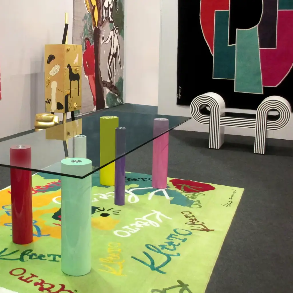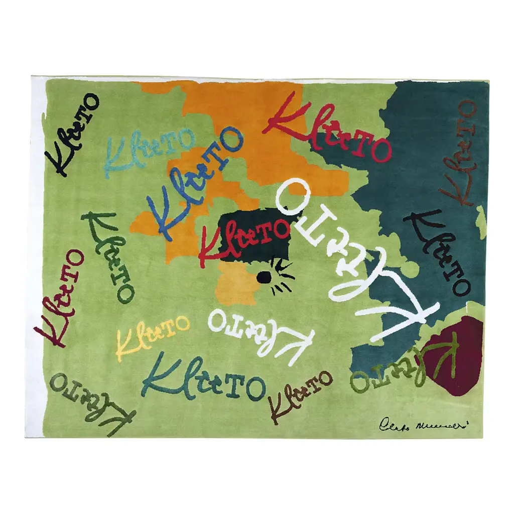 This brightly colored rug will make a striking statement when placed within a contemporary setting, whether in the home, office, or public space. It was hand crafted in Turkey using fine linen, wool, mohair, and silk and it was designed by Cleto Munari. It is part of a limited series of only 29 specimens. Multi-colored decorations grace its surface making is a joy to behold.