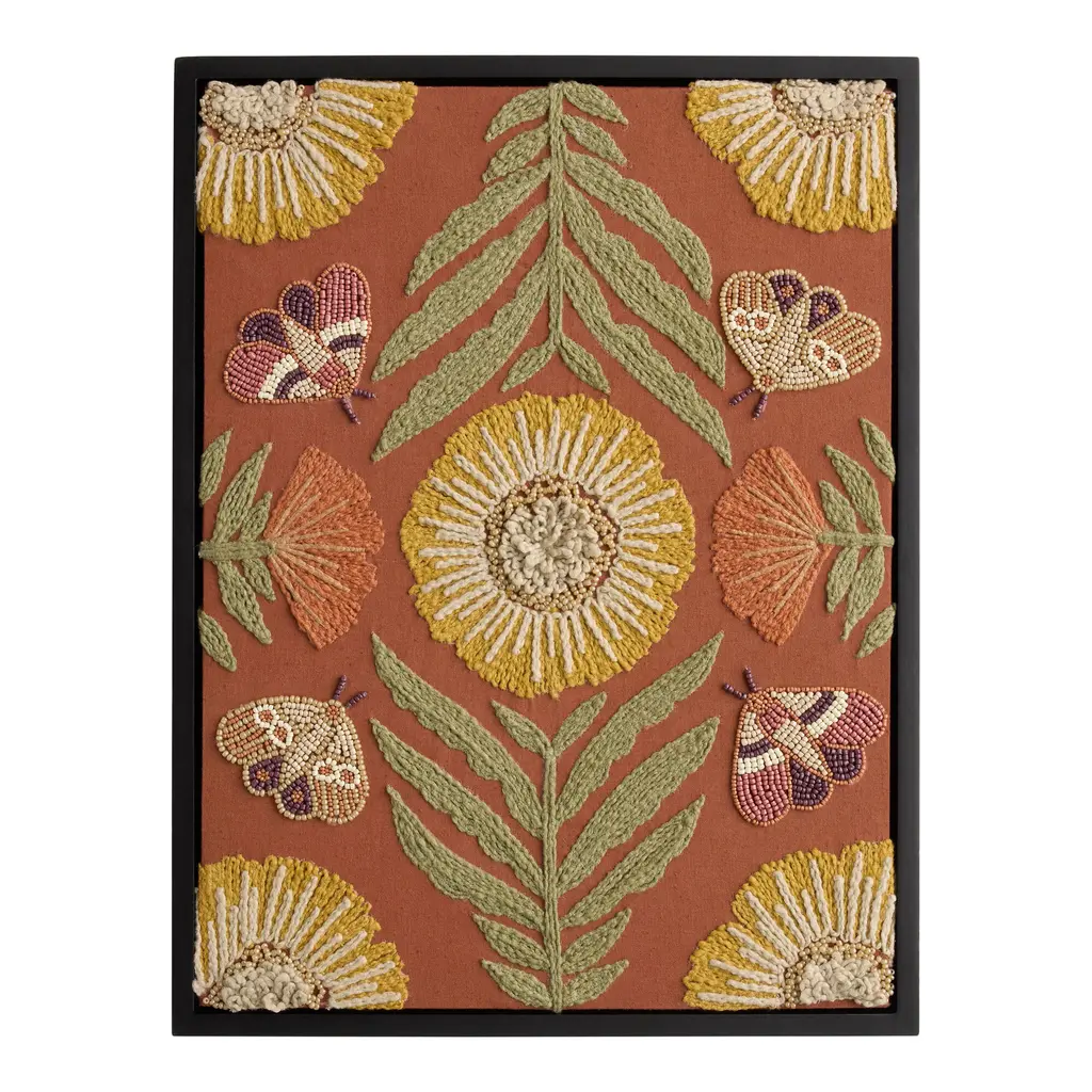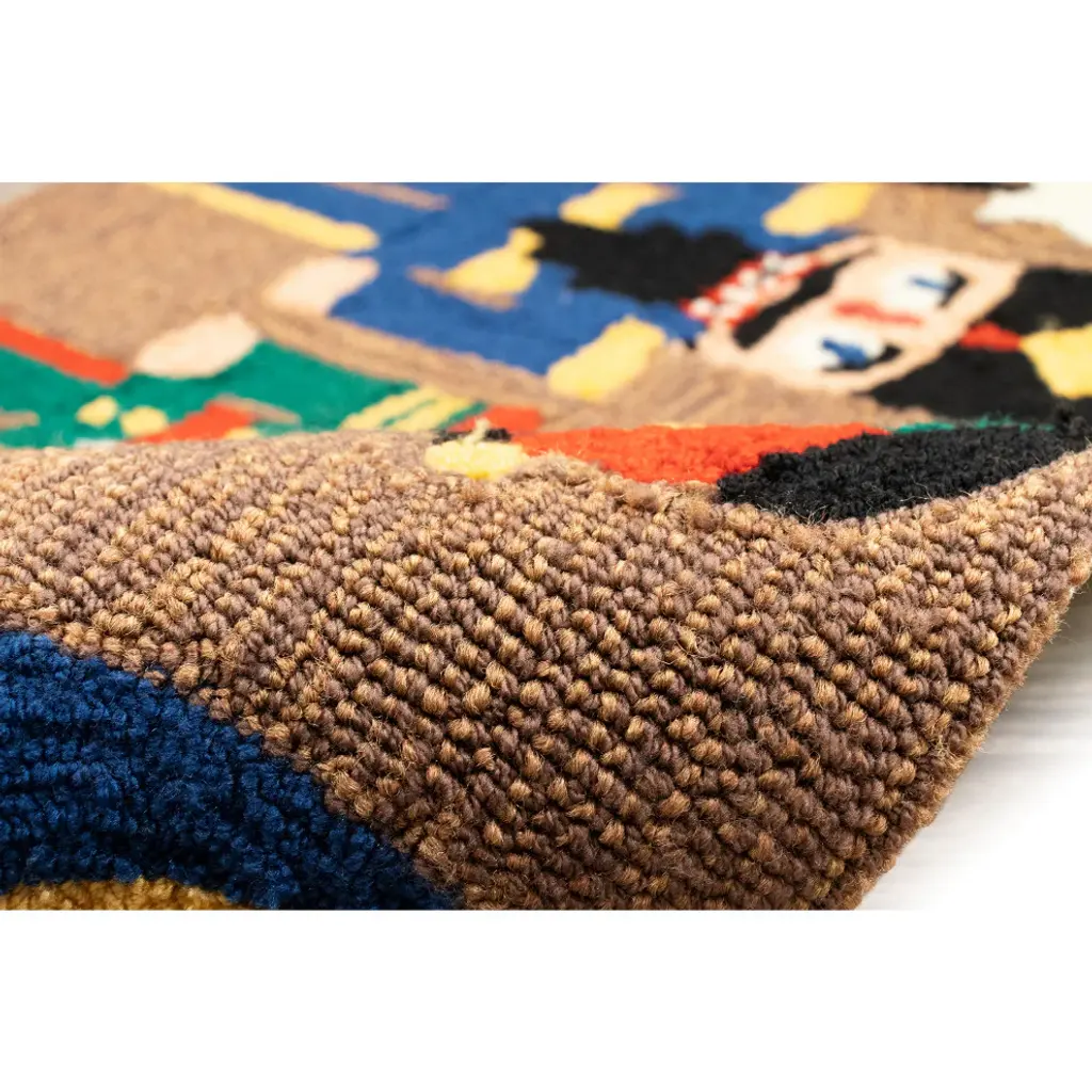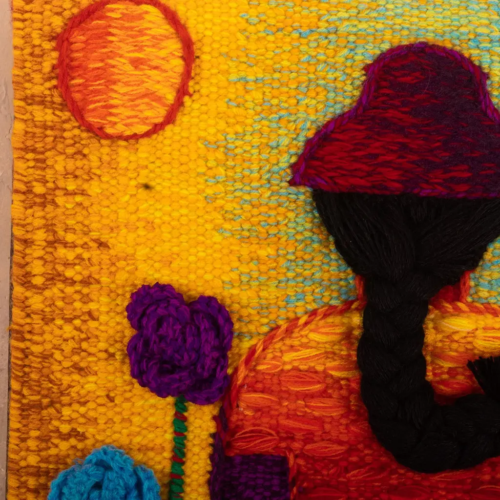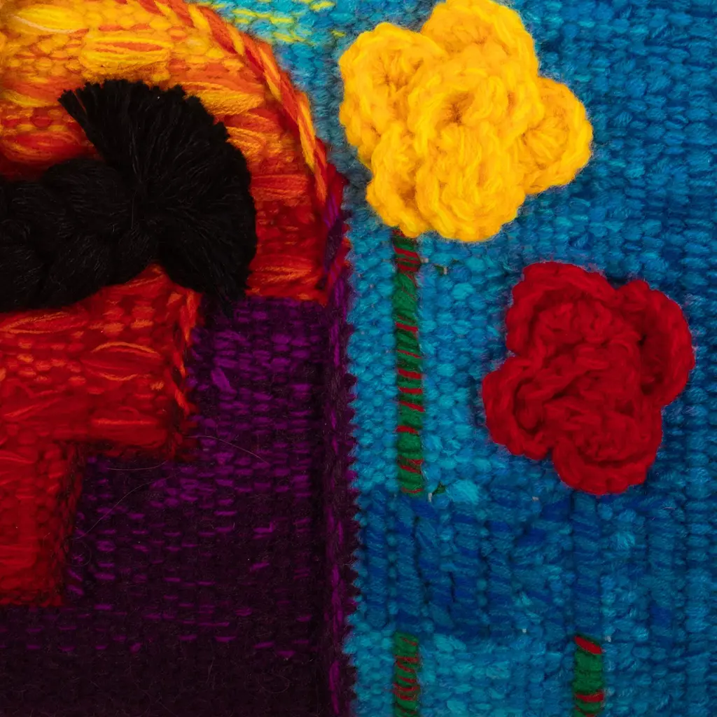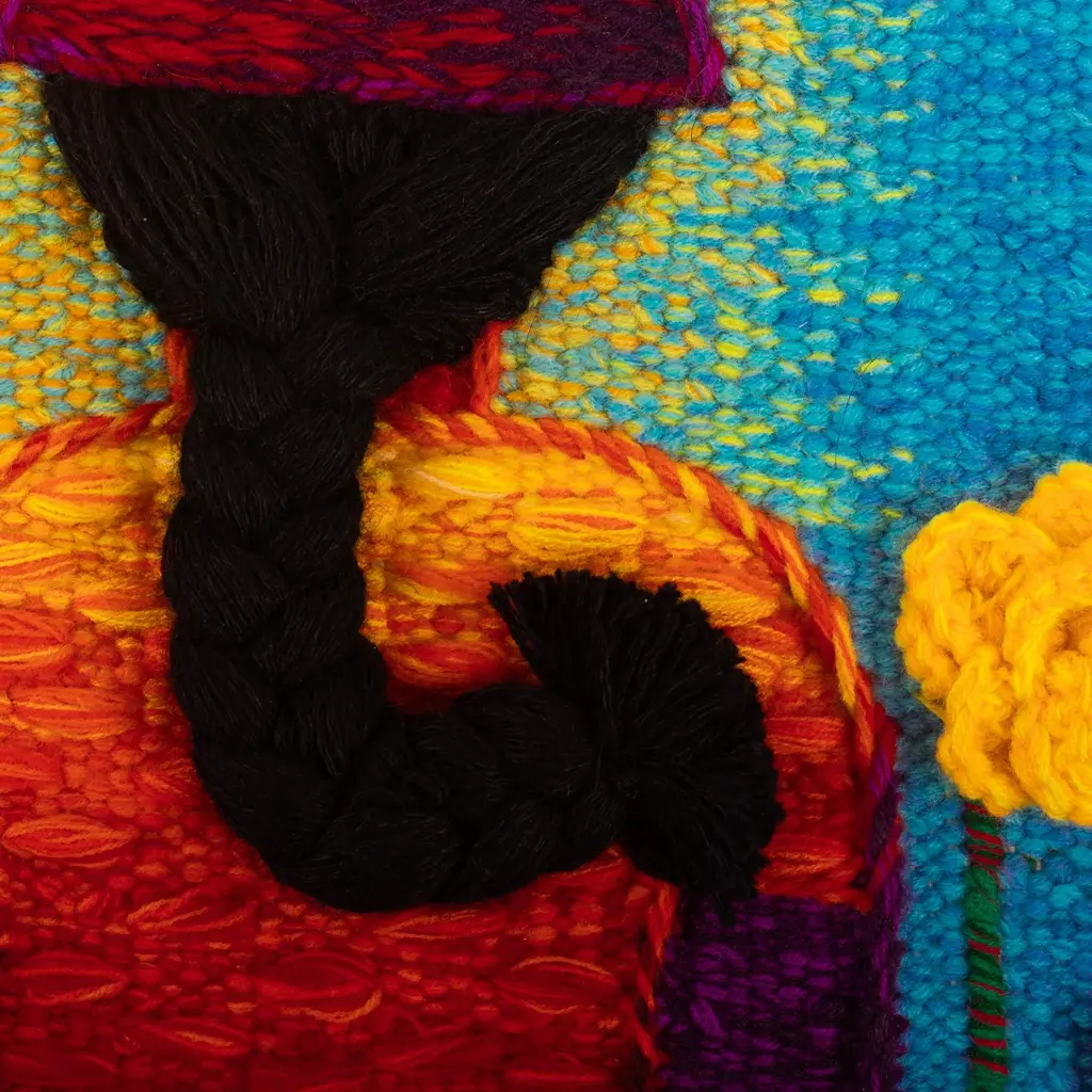 Artist Inka of Lima, Peru designs and supervises the weaving of these charming portraits done in alpaca and other fibers. The design is drawn and digitized to match with the colors of the threads. Almost all is handwoven, with the flowers crocheted and attached. It is signed by the artist, and hanging apparatus is included.