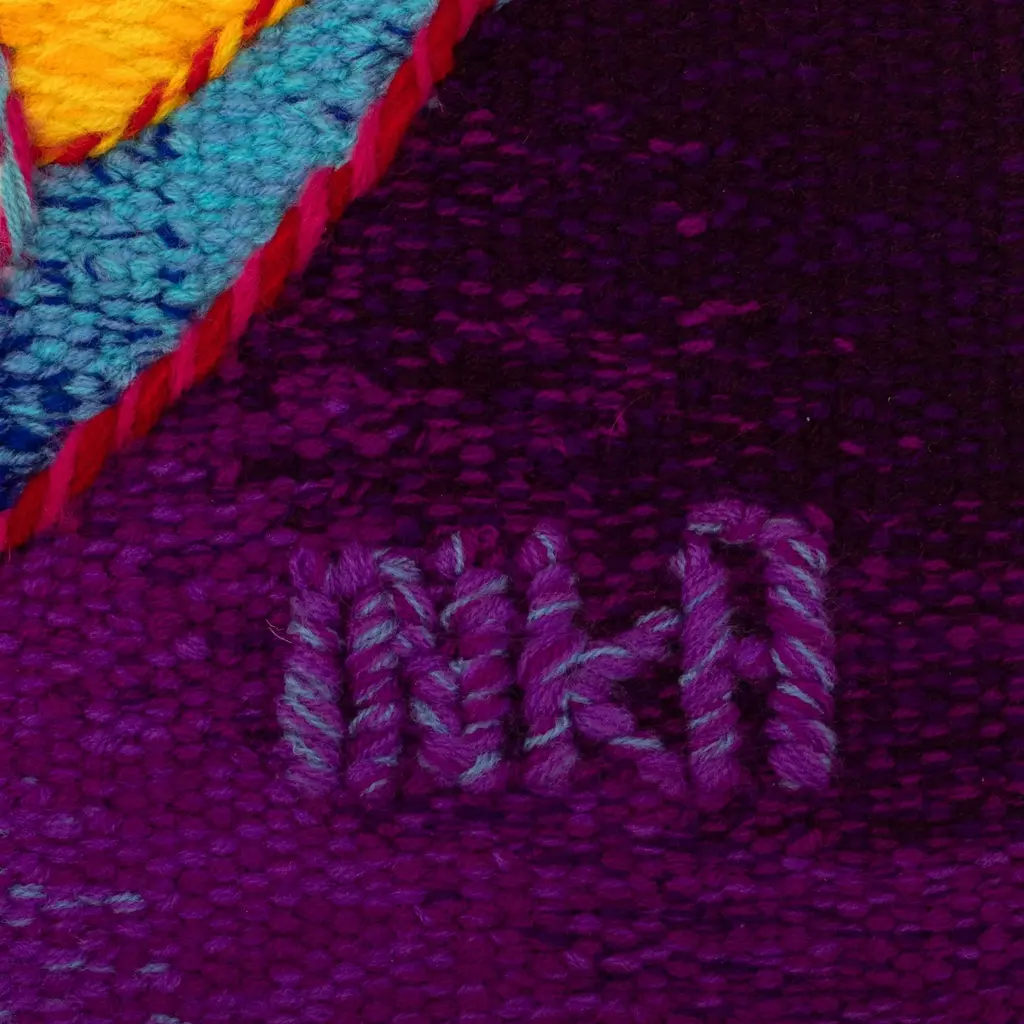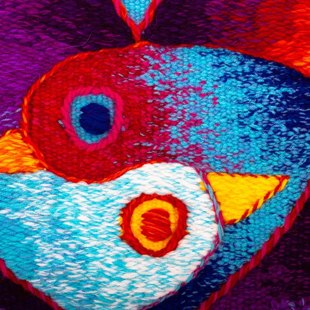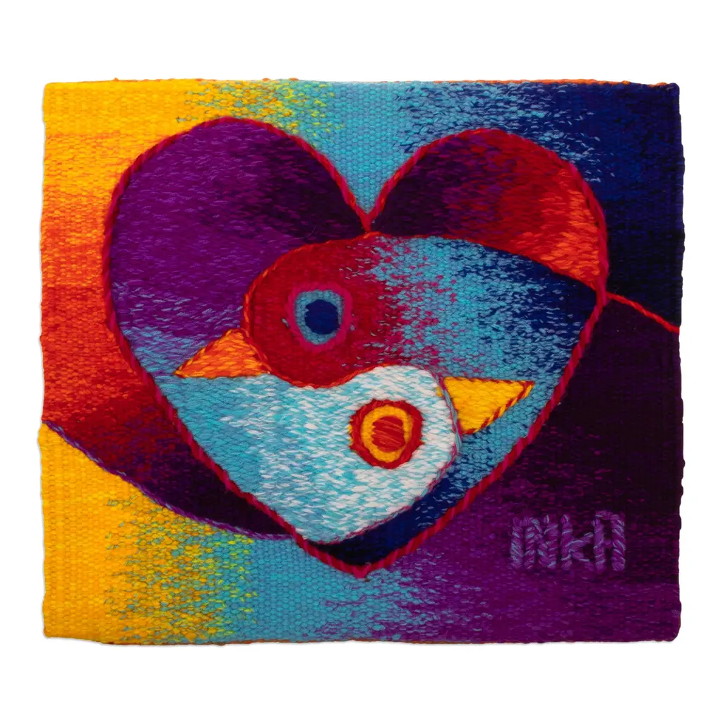 Bold colors and design make this handwoven tapestry a stand out. It is designed by Inka and woven by hand on a traditional loom. The image of lovebirds inside a heart is inspired by motifs from Peruvian culture.