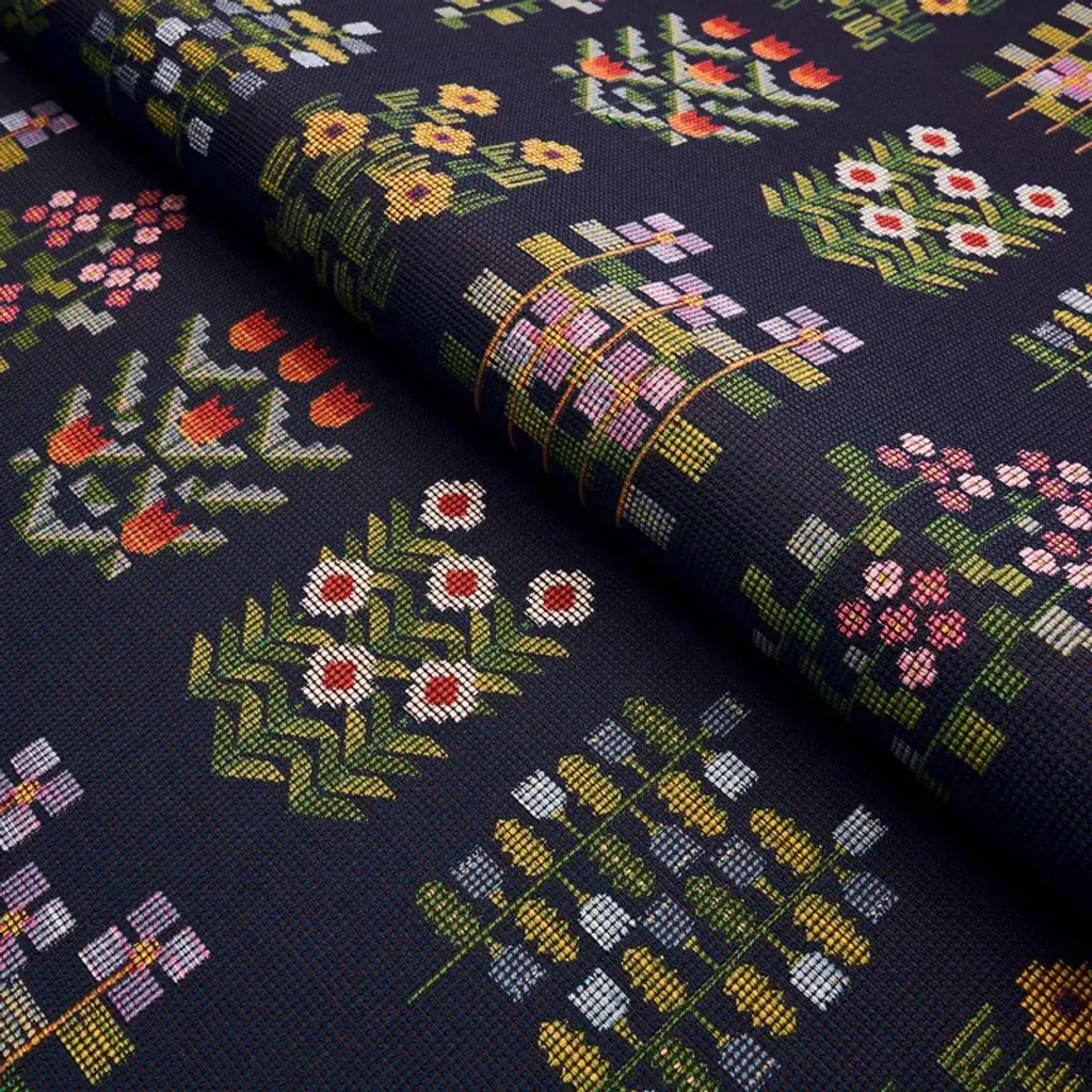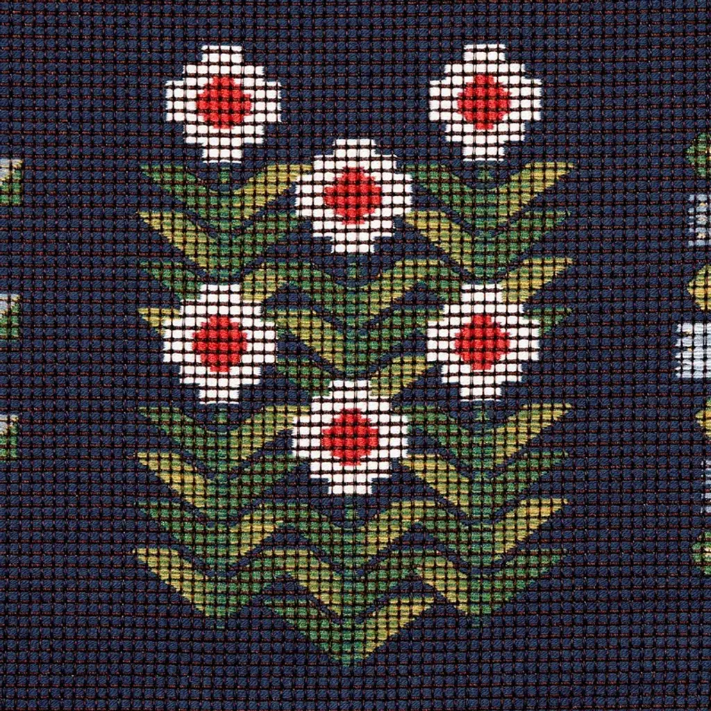 Based on original artwork that was hand-drawn in our studio, Annika's floral tapestry derives its charm and geometric simplicity from early 20th-century Swedish textiles and cross-stitch samplers. A sturdy tapestry weave gives this mid-scale floral fabric the look of needlepoint, along with a wonderful hand.
