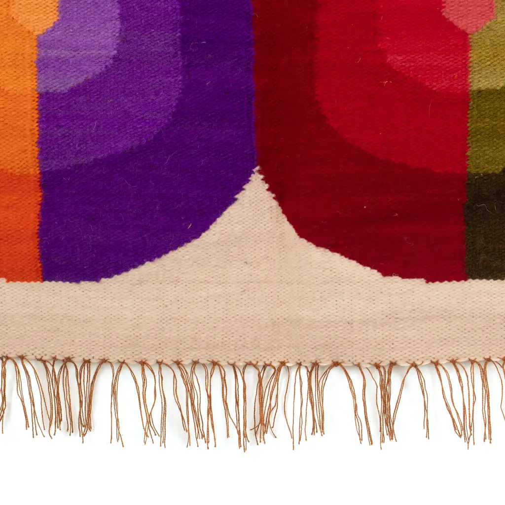 Chola is a term referring to indigenous and mestizo women from the Andes that now applies to all who wear the traditional costumes established during the initial process of mestizaje (mixing of cultures) in the current Andean region. Peru's Gerardo Fernandez creates a breathtaking Ayacucho tapestry expertly handwoven from wool depicting three cholas in abstract style. "The women are wearing typical hats and colorful skirts. Each figure is carefully detailed, capturing the richness of the textiles and the bright hues that characterize their attire," says Fernandez. The eco-friendly tapestry is colored with natural dyes obtained from organic sources like cochineal and tree leaves, bark, roots and fruits.