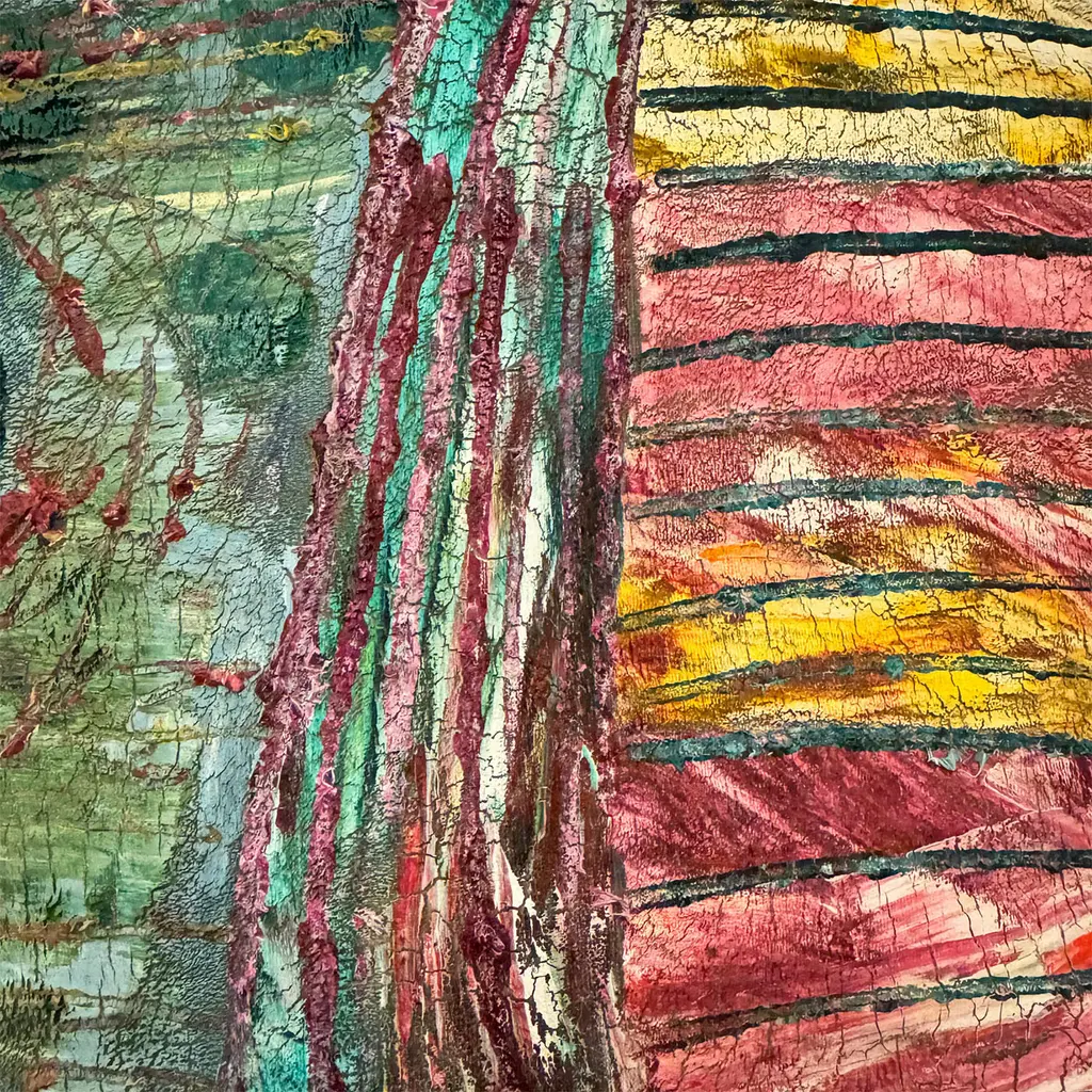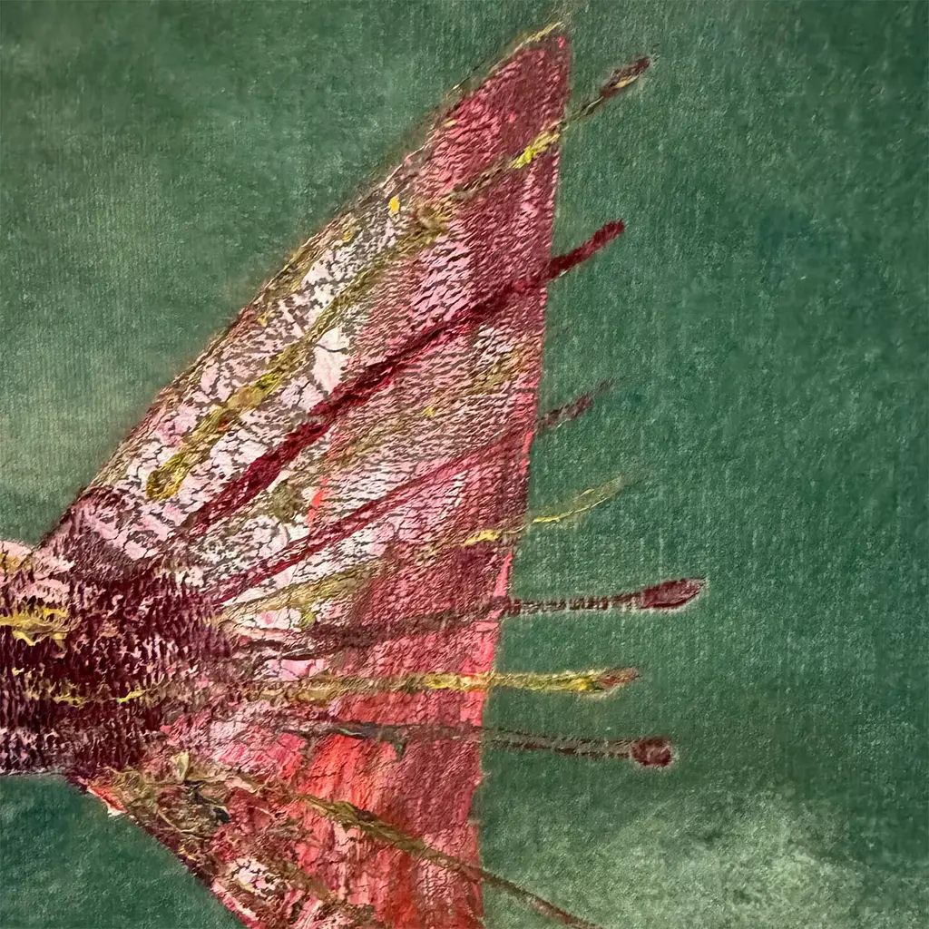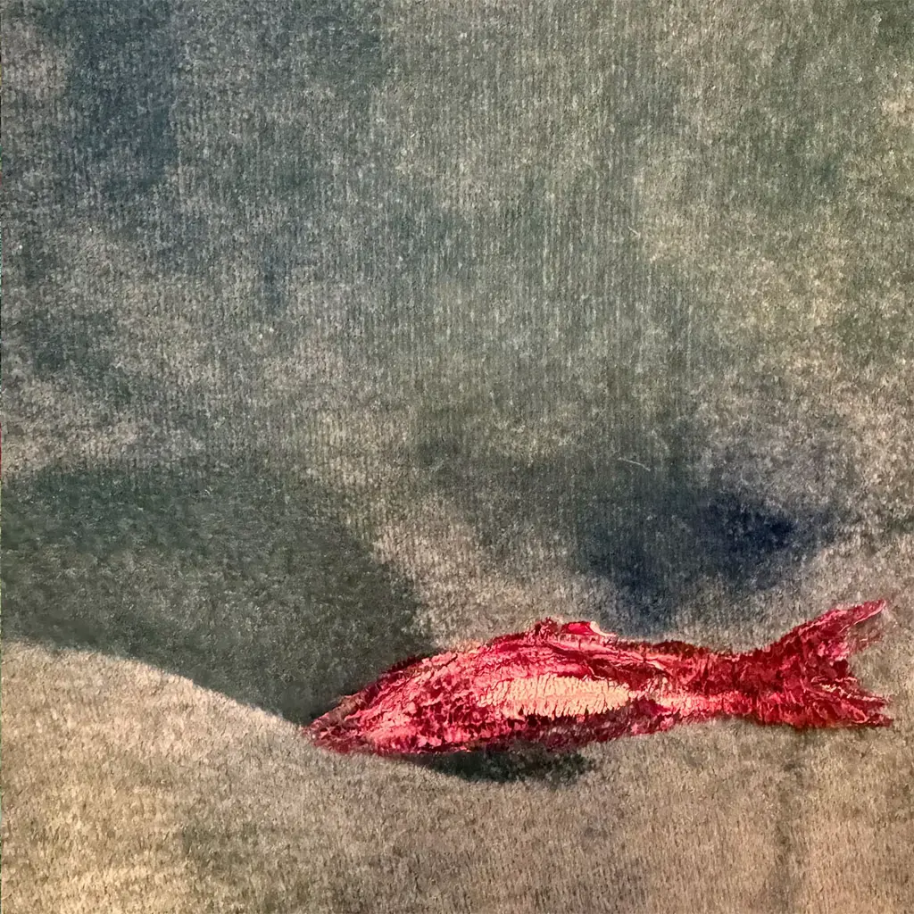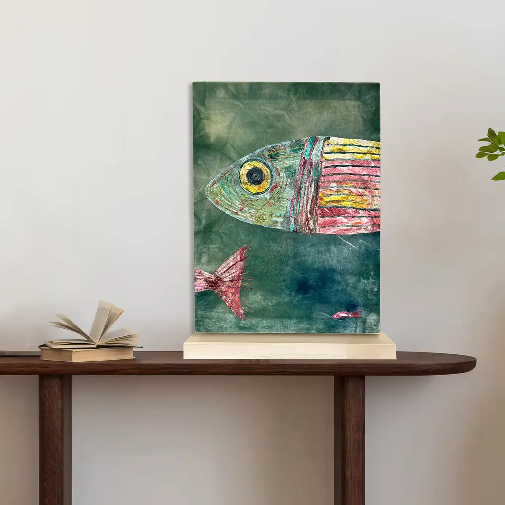 This piece is an intricate small-sized tapestry featuring a vibrant fish motif crafted on silk velvet. Natural yellow pigments and colored pastes are painted to produce an intense chromatic depth. The unique artist-invented technique offers a sophisticated three-dimensional effect, allowing the piece to function both as wall art and, when displayed on a pedestal, as a striking sculptural object.