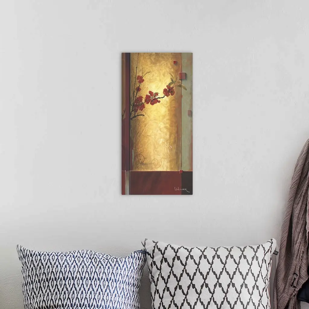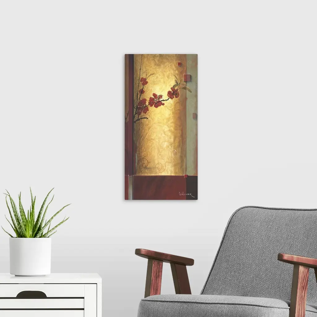 A contemporary painting with red cherry blossoms bordered with a square grid design.