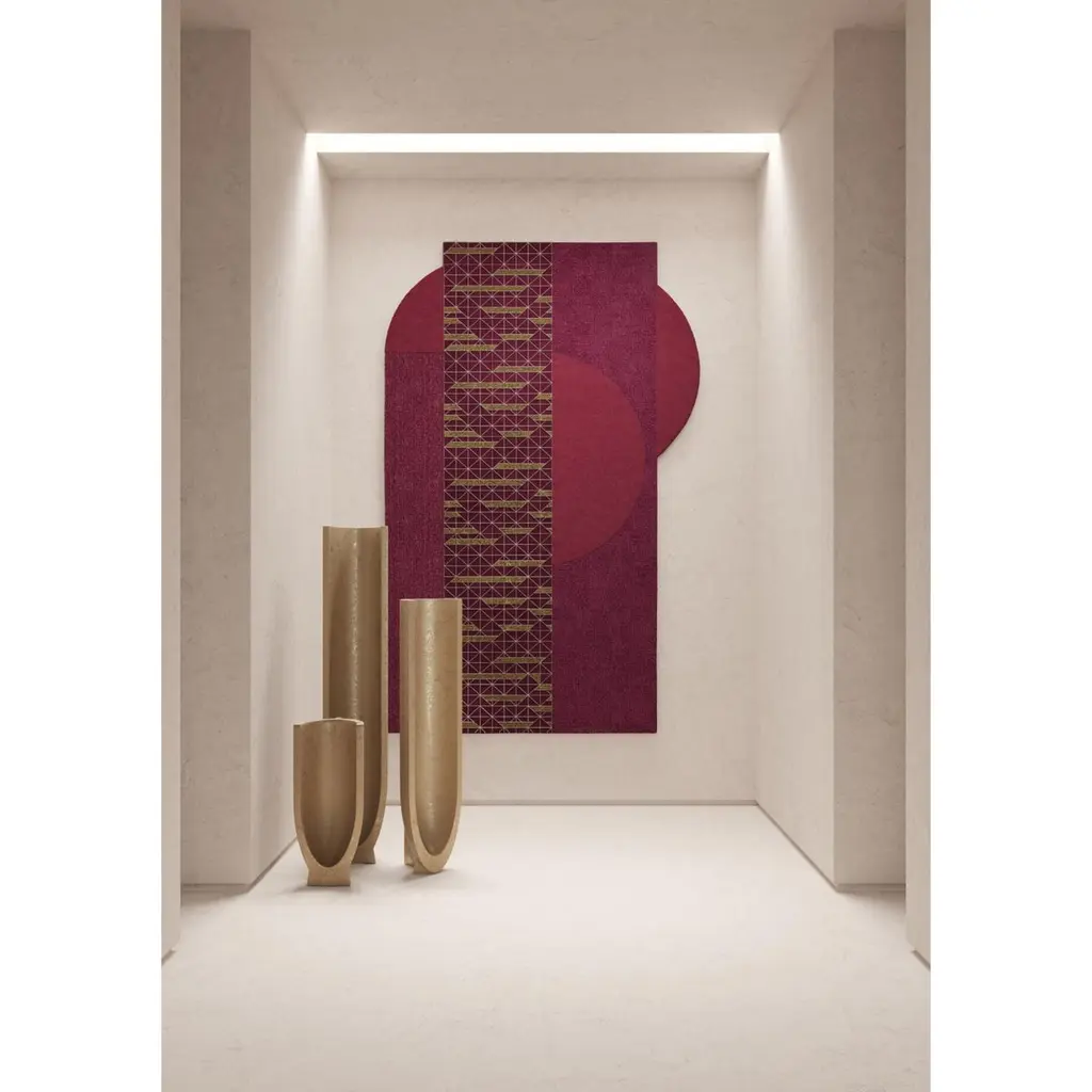 Casablanca Burgundy Wall Tapestry by Antilla Di LauroDimensions: L 250 x H 160 cm.Materials: Semi-worsted wool, fine bamboo silk, and lurex.Antilla Di Lauro (b. 1989, Milan, Italy) designs and creates one-of-a-kind rugs and tapestries. After earning a Master's degree with honors in Sustainable Architecture from Politecnico di Milano, she started her career working with Patricia Urquiola, one of the key figures in contemporary design. Subsequently moving to Dubai and joining HBA/Hirsch Bedner Associates, the world's leading hospitality interior design firm, played a crucial role in shaping her artistic trajectory. During those years, she delved into rug design, a path that led her also into the intricate world of tapestry. Driven by a deep-rooted passion for travel and the captivating pull of discovering new cultures, Antilla Di Lauro further broadened her horizons. She ventured to Saudi Arabia to work for the Crown Prince Private Affairs, managing the interior design of His Royal Highness’s private palaces. Her voyage continued to Zurich, where she assumed the role of Design Director at Hyatt, overseeing architecture, design, and art for new hotels across Europe, Africa, and the Middle East. Drawing inspiration from her enriching experiences, Antilla Di Lauro devoted herself to the art world embarking on a profound creative quest. Antilla Di Lauro's pieces embody a symphony of influences drawn from the various geographies that have shaped her life and career. Her work explores themes close to her heart - travel, freedom, and fearlessness - blending them seamlessly with the introspective journey of self-reflection and self-development, all through the transformative power of art. She is particularly intrigued by the transcendent potential of tapestry, creating multi-layered pieces that mirror the complexity of human existence. In her creative practice, Antilla Di Lauro experiments with various materials, ranging from time-honored wool, bamboo silk, and linen textures to the cutting-edge use of recycled plastic. Her work transcends traditional mediums, forming a tactile connection between the observer and her artistic perspective.
