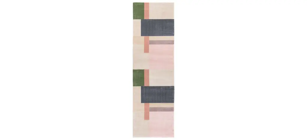 Available in limited edition of 36 pieces, this rug designed and signed by Chung Eun Mo is made by hand using the Tufenkian Shakti weave. The pattern is defined by bands of grey, black, and blue punctuated by triangles and rectangles to reveal new shapes and colors: panels of orange, light blue, blush pink, purple, green, and yellow. This intricate puzzle of colors and forms reveals an intrinsic dynamism and connection between color and form that will enliven any eclectic or mid-century interior. Handmade by craftsmen in Uma technique. 20 Carpets Collection.