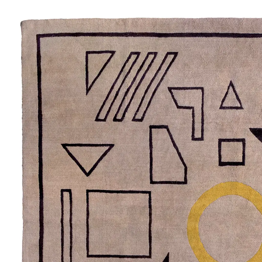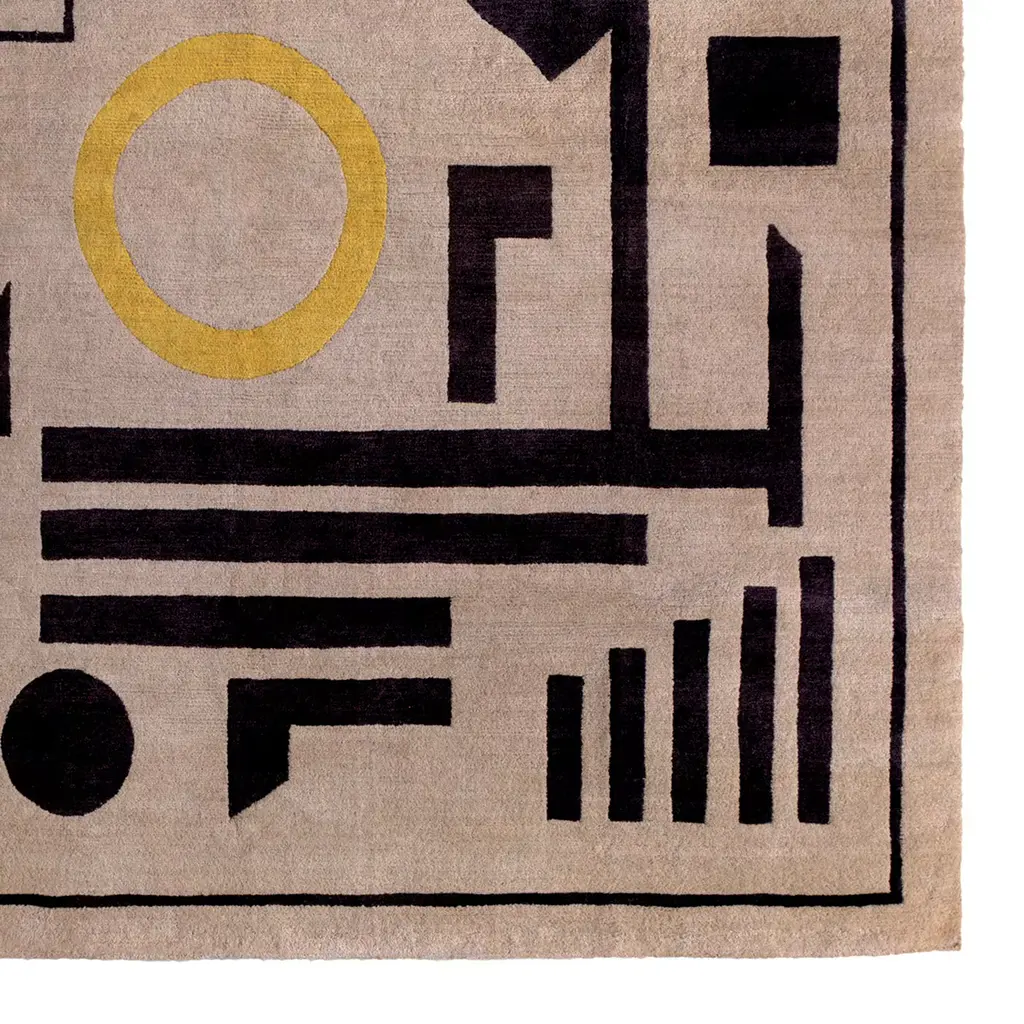 This exquisite carpet was made entirely by hand, from the preparation and carding of the wool to its knotting. The expert artisans who worked on this piece, that is part of a limited series of 36 one-of-a-kind pieces, are in Nepal and use the traditional Tibetan knot that mixes cotton and Tibetan wool, one of the finest in the world. The result is a celebration of artisanal craftsmanship that in this case features black geometric decorations for a contemporary look. Handmade by craftsmen in Uma technique. 20 Carpets Collection.