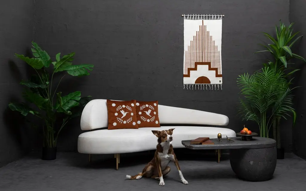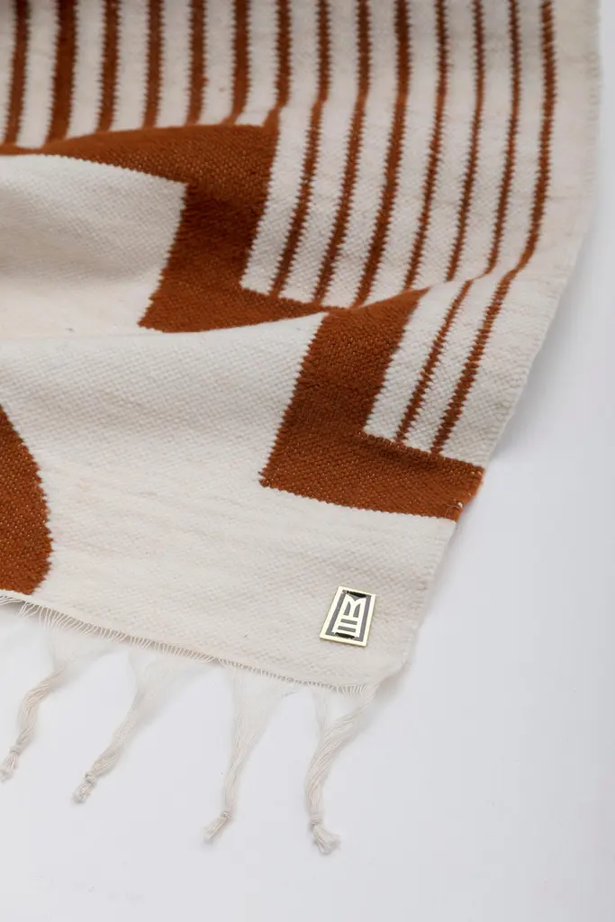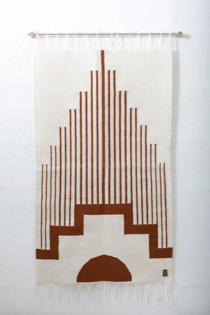 Handwoven sheep wool tapestry with wall-mounting lathed aged bronze bases, and stainless steel rod.Capturing the essence of the Andes, these pieces are created using ancient weaving techniques yet loomed through an innovative approach to traditional woven iconography. They are elegantly finished with bronze or stainless steel hanging rods, adding an additional touch of sophistication.SOULFUL OBJECTS represent a journey through our heritage and traditions. A family of objects that depict the autochthonous materials and artisan methods of Ecuador. The collection comprises an array of decorative and functional objects— bowls, candleholders, decorative pillows, and tapestries— showcasing materials such as hand-carved volcanic stone from the quarries of Chimborazo, Ecuador's highest and dormant volcano, opulent bronze, stainless steel, and sumptuous velvet.The designs collectively tell our story of Latin America. Every object is the result of a thoughtful approach to Ecuadorian material culture and iconography. Selecting the ideal artisan technique to produce a sophisticated, modern abstraction. An ideal platform for our artisans to embed their generational knowledge. Leaving their soul's signature on every seam, every crease, every chisel mark.ANDEAN studio’s practice is an exploration that highlights Ecuador's iconography and our Latin American essence. New items will be added to our ongoing collections every year, each bearing our equatorial design stamp and a distinct aesthetic.ARTISANS:Marco Panamá: Handwoven TapestriesEdison Simbaña: Bronze and Stainless Steel CNC Lathe