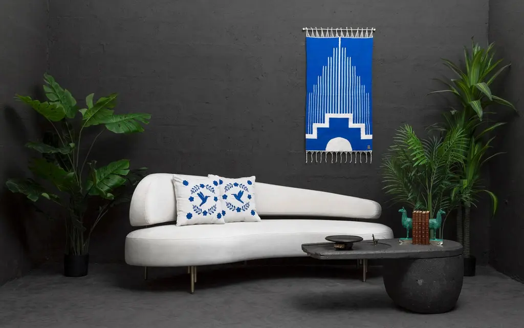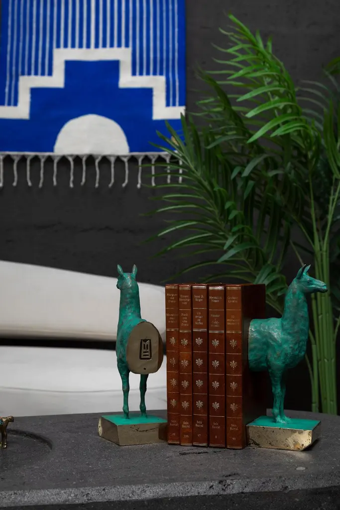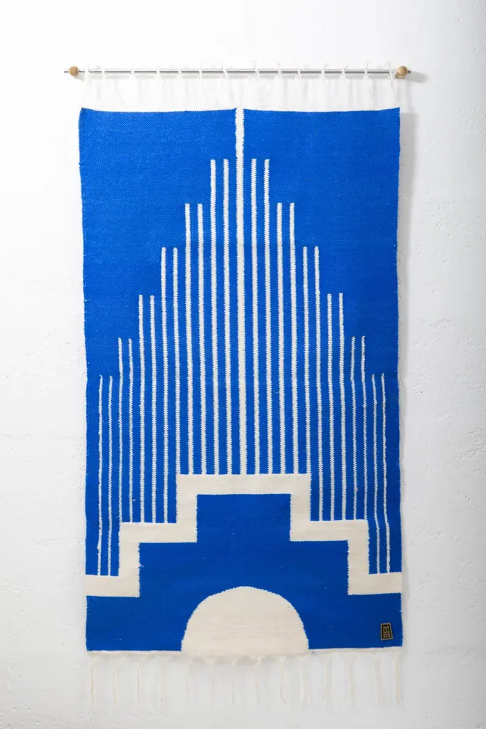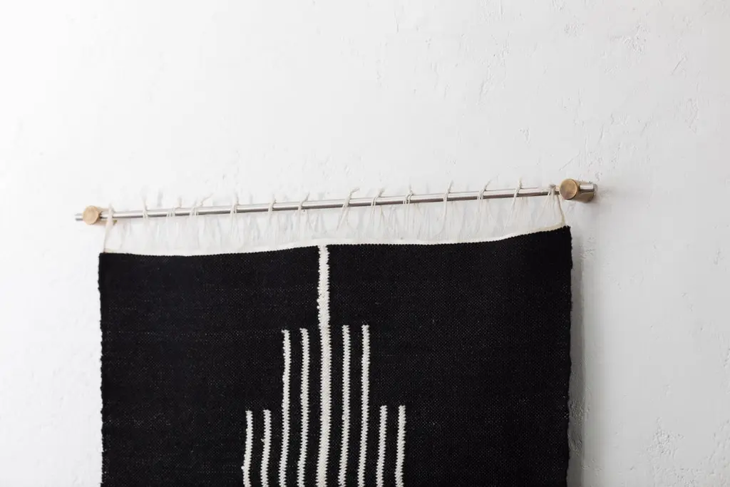 Handwoven sheep wool tapestry with wall-mounting lathed aged bronze bases, and stainless steel rod.Capturing the essence of the Andes, these pieces are created using ancient weaving techniques yet loomed through an innovative approach to traditional woven iconography. They are elegantly finished with bronze or stainless steel hanging rods, adding an additional touch of sophistication.SOULFUL OBJECTS represent a journey through our heritage and traditions. A family of objects that depict the autochthonous materials and artisan methods of Ecuador. The collection comprises an array of decorative and functional objects— bowls, candleholders, decorative pillows, and tapestries— showcasing materials such as hand-carved volcanic stone from the quarries of Chimborazo, Ecuador's highest and dormant volcano, opulent bronze, stainless steel, and sumptuous velvet.The designs collectively tell our story of Latin America. Every object is the result of a thoughtful approach to Ecuadorian material culture and iconography. Selecting the ideal artisan technique to produce a sophisticated, modern abstraction. An ideal platform for our artisans to embed their generational knowledge. Leaving their soul's signature on every seam, every crease, every chisel mark.ANDEAN studio’s practice is an exploration that highlights Ecuador's iconography and our Latin American essence. New items will be added to our ongoing collections every year, each bearing our equatorial design stamp and a distinct aesthetic.ARTISANS:Marco Panamá: Handwoven TapestriesEdison Simbaña: Bronze and Stainless Steel CNC Lathe
