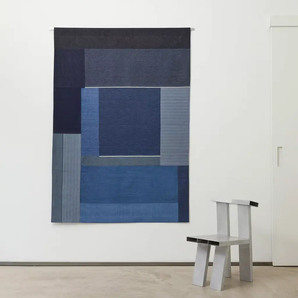 Designed by designer Giulia Fauro Alessi, the Cowboy tapestry in denim, elevates the simple design in sophisticated art. Inspired by the folk culture of the southern United States, explores the theme of patching, mending, and recomposing work clothes, such as blue jeans. Denim, usually associated with a popular use and of little value, is ennobled. The tapestry also includes a satin-finished aluminum rod, no.2 holes, 0.5mm L148 x H2 x P1 cm, and a cotton lining.