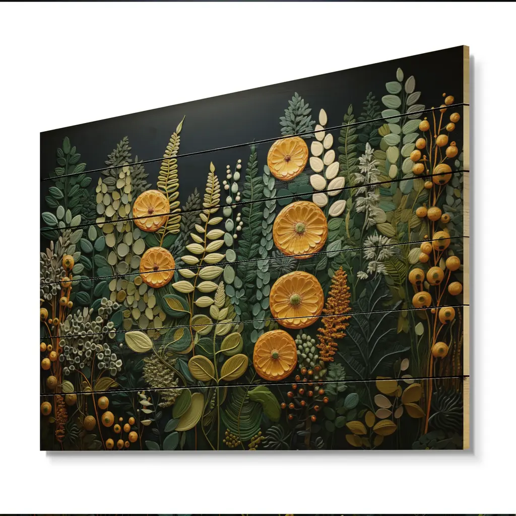Designart "Yellow Ferns Plant Forest Tapestry" Floral Print On Natural Pine Wood - 32 In. Wide X 24 In. High
