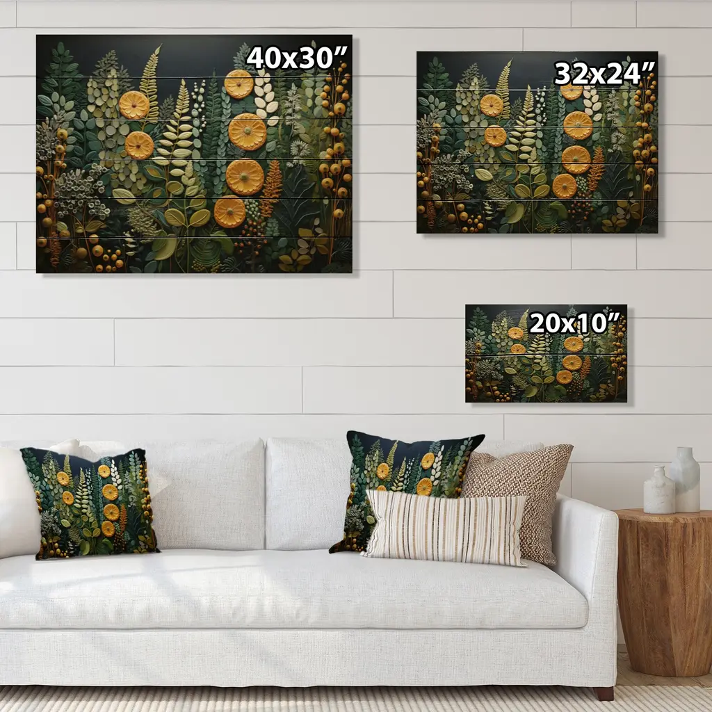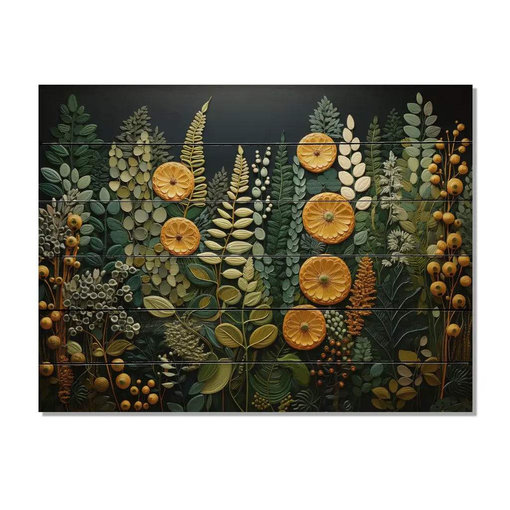 Designart "Yellow Ferns Plant Forest Tapestry" Floral Print On Natural Pine Wood - 40 In. Wide X 30 In. High