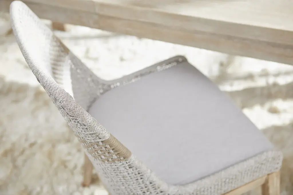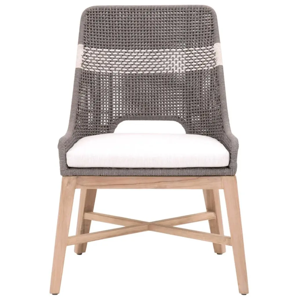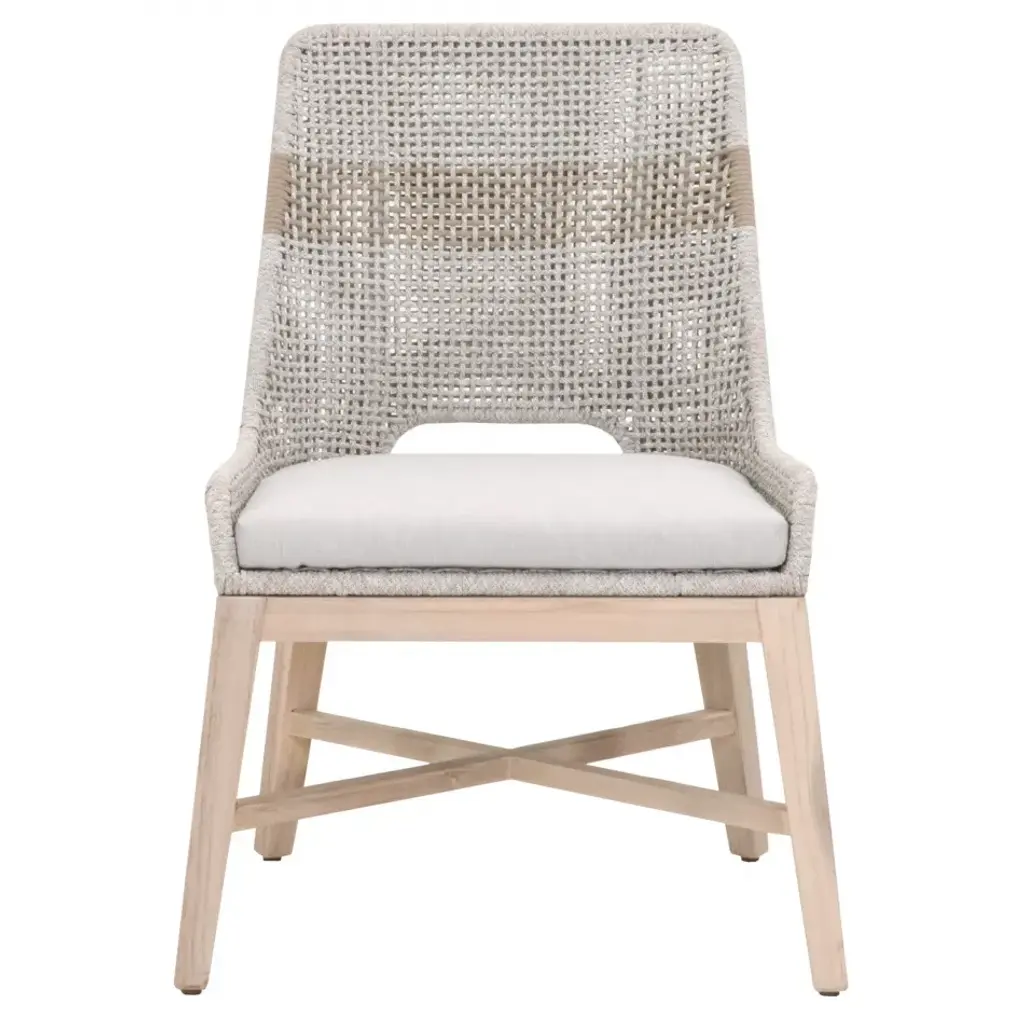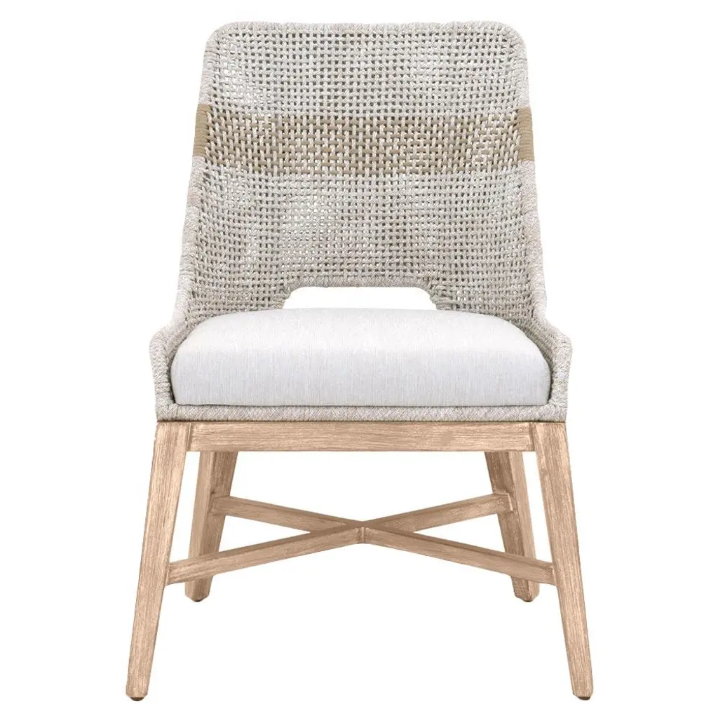 Transitional style dining chair featuring interwoven rope pattern and "X" stretcher base design. These woven side chairs will add a touch of coastal style to your kitchen or dining room. Constructed with a steel frame and solid mahogany legs, these dining chairs are not only sturdy, but durable. Paired with an upholstered seat cushion affixed to the base, the chairs provide comfort with style and will be the perfect addition to any transitional or traditional dining room.