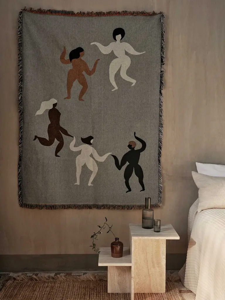 Bring a sense of soft serenity to your space with the Free Tapestry Blanket. With its calming motif of five dancing figures woven from GOTS certified, organic cotton using classic tapestry techniques, it will add a lovely, graceful touch to your space. The blanket is completed by decorative fringing along the edges. Let it lie casually over the armrest on your sofa or hang it on your wall as a tactile, impactful decoration.