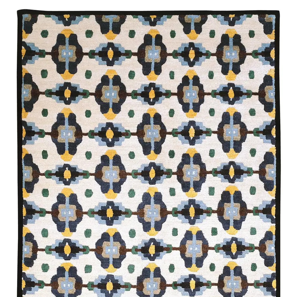 This elegant wool carpet is part of a 36-piece limited series designed by George J. Sowden, who also signed each piece. Because it was entirely handmade (from the harvesting of the Tibetan wool to its knotting and the final steps of finishing), this rug can slightly change from the photo and represents a one-of-a-kind floor decoration that will make a statement in any decor. Its exquisite craftsmanship and modern design make it a timeless piece. Handmade by craftsmen in Uma technique. Life's Commodities 2003 Collection.