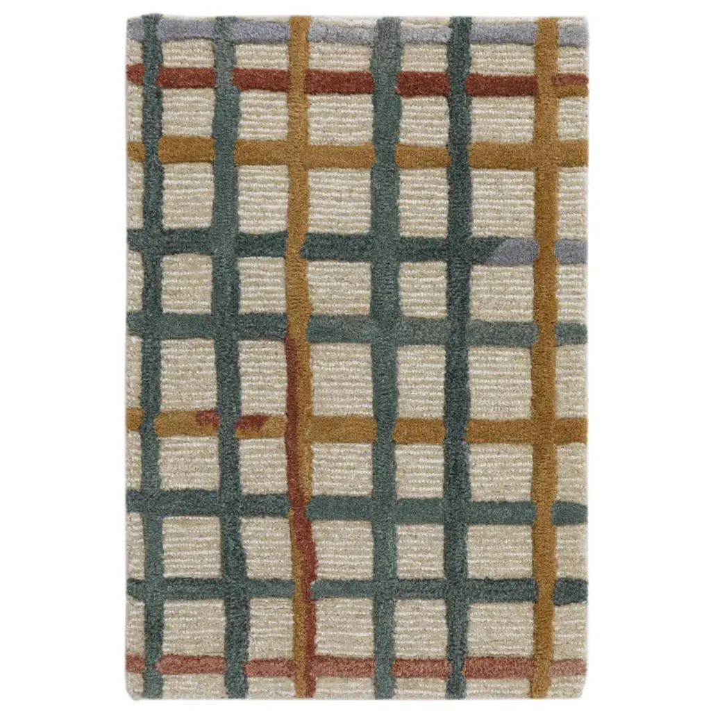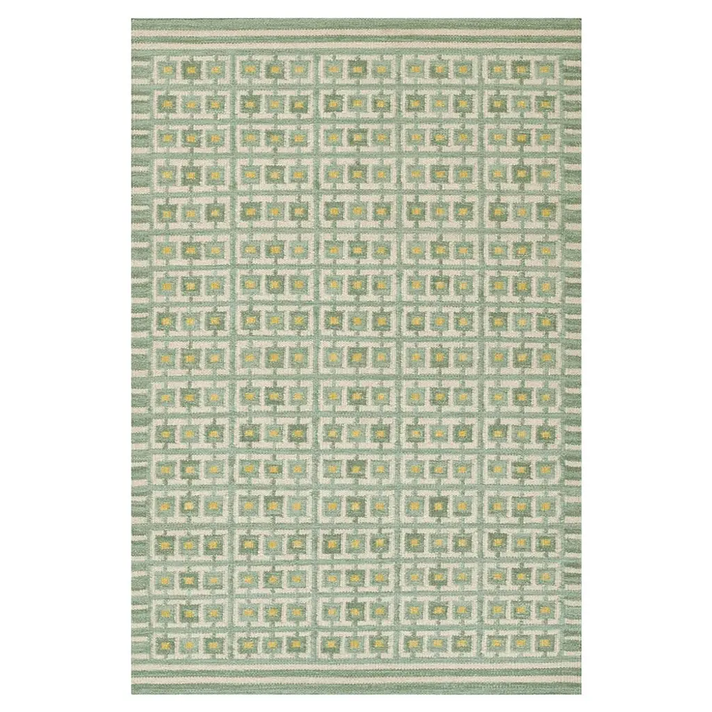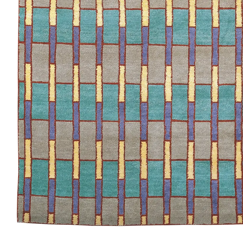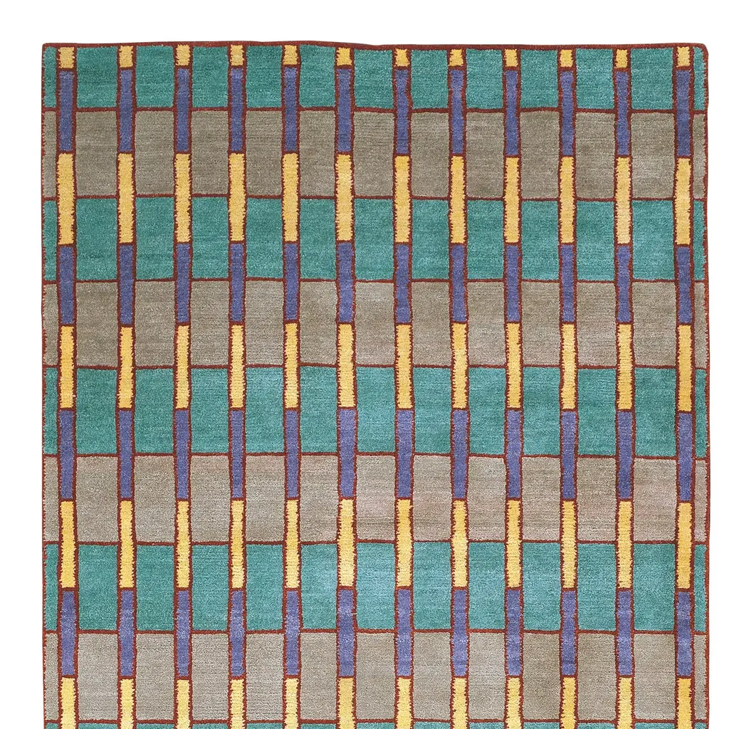 This carpet designed by George J. Sowden is part of a 36-piece series signed by the designer and entirely handmade in Nepal by artisans who still use ancient artisanal methods in working the Tibetan wool, knotting it by hand, dying it by hand, and following every step of production. The warp is in cotton, while the soft Tibetan wool makes the weave. This one-of-a-kind piece of functional design features a series of geometric patterns in green and yellow that will add a touch of color to any home. Handmade by craftsmen in Uma technique. Life's Commodities 2003 Collection.
