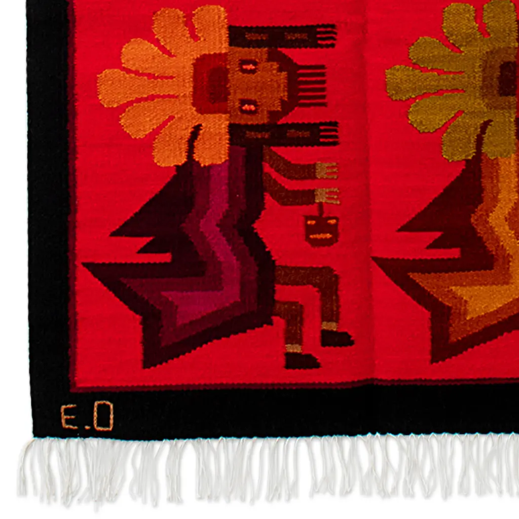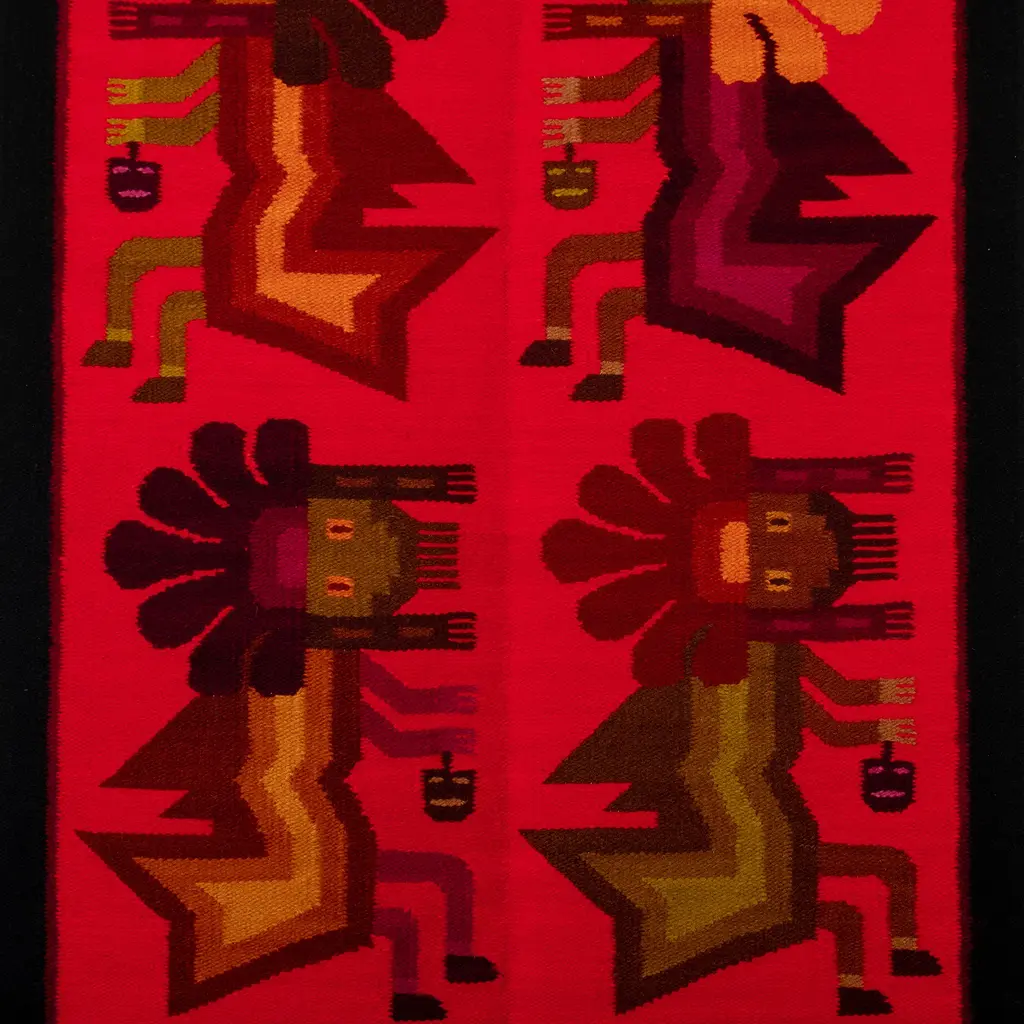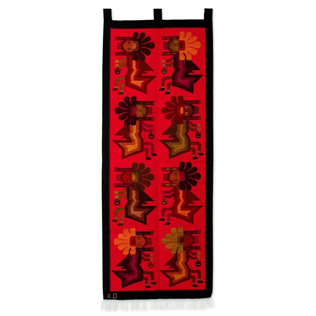 The ancient Inca Empire developed a communication system where the famous chasquis would run long distances carrying messages to their destiny, often offering translation services and tracking community statistics. But Peruvian artisan Eliazar Ochoa shows us another characteristic of these ancient messengers, creating this sublime handloomed wool tapestry to portray the lustrous image of the mythical antarqui, the flying messengers of the Inca Emperor. After choosing a palette of red hues, the artisan depicts the ancestral delegates in the traditional Andean style, as the legends told about them: strong men that used to fly from mountain to mountain with an antique hang glider artifact.