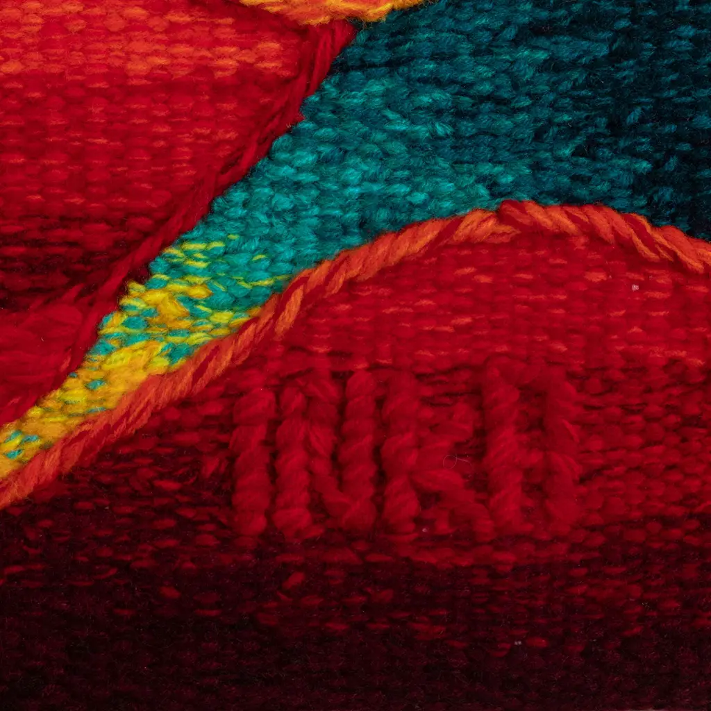 By Peruvian artisan Inka, this vibrant tapestry celebrates the "fruit of the sea." In fantastical tones of red and orange, a single fish takes center-stage, surrounded by blue ocean waves and other fish. Inka works on a traditional loom as he diligently hand-weaves this composition from an alpaca wool blend. This tapestry is displayed on a wood stretcher.