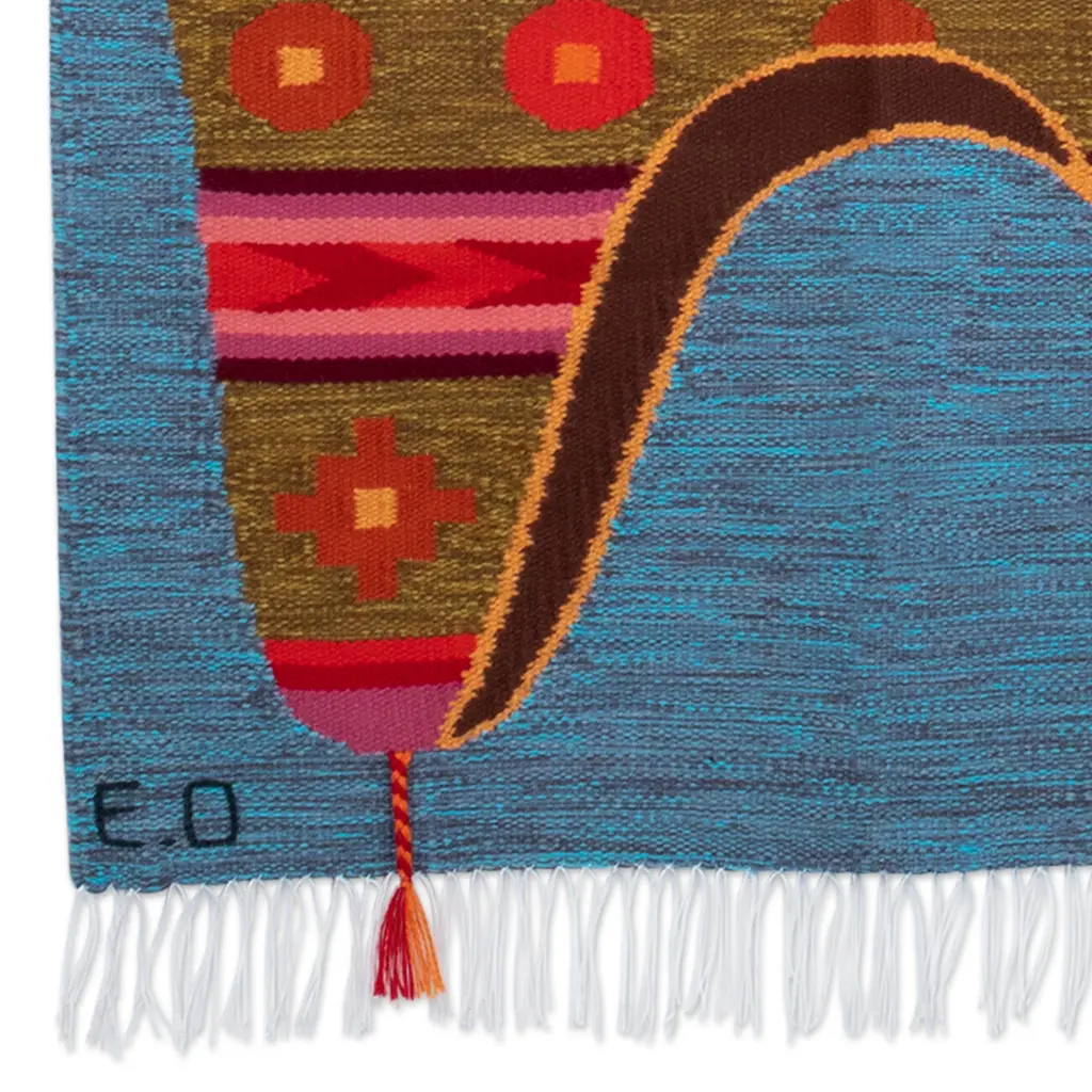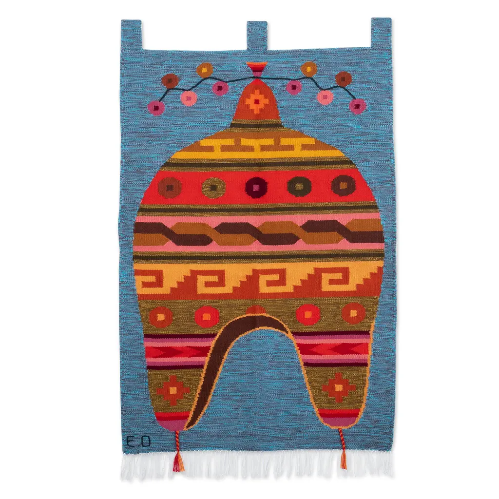 Transport yourself to the vibrant culture of the Andean region with this enchanting wall tapestry by Peruvian artisan Eliazar Ochoa. Inspired by the iconic chullo hats, this masterpiece is expertly hand-woven from wool, infusing your space with a rich sense of cultural heritage. With a symphony of lively red, brown, green, orange, purple, yellow and pink hues against a blue background, it adds vibrancy to your surroundings, making it a striking focal point in any room.