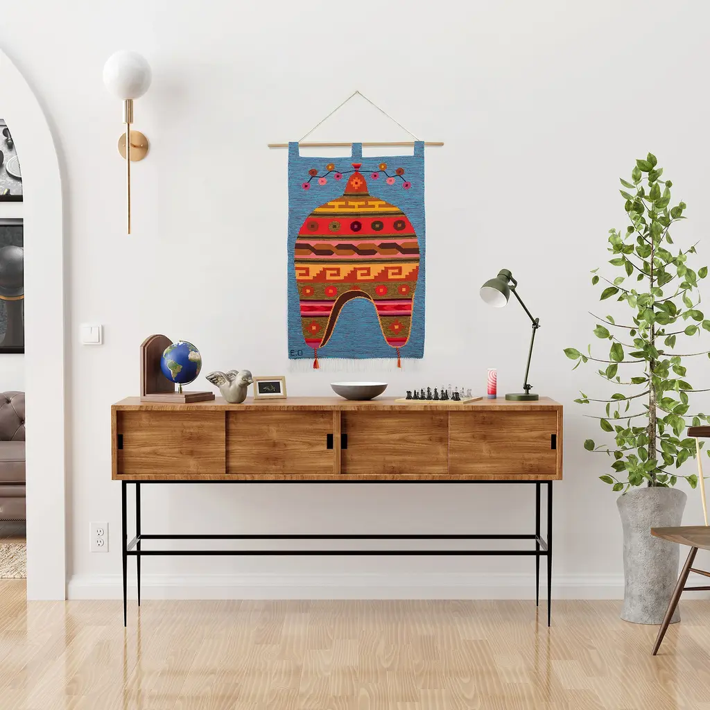 Handwoven Wool Wall Tapestry With Andean Chullo Hat Motif- Chullo Hat